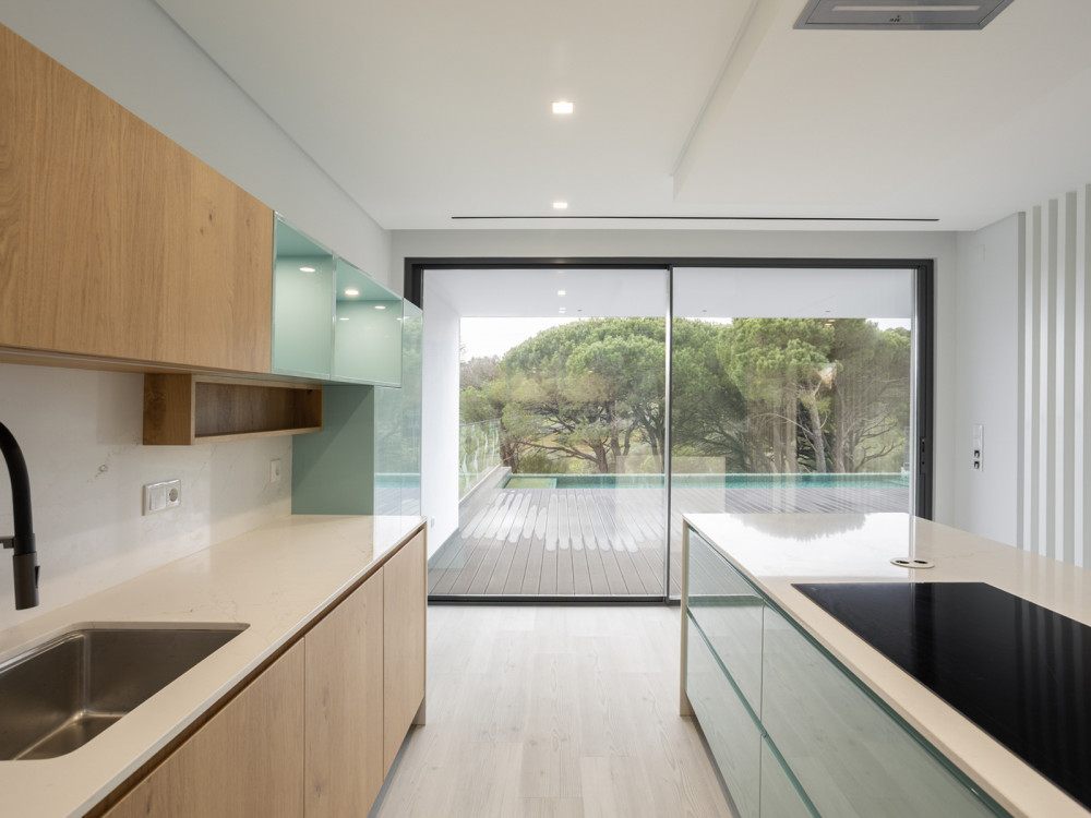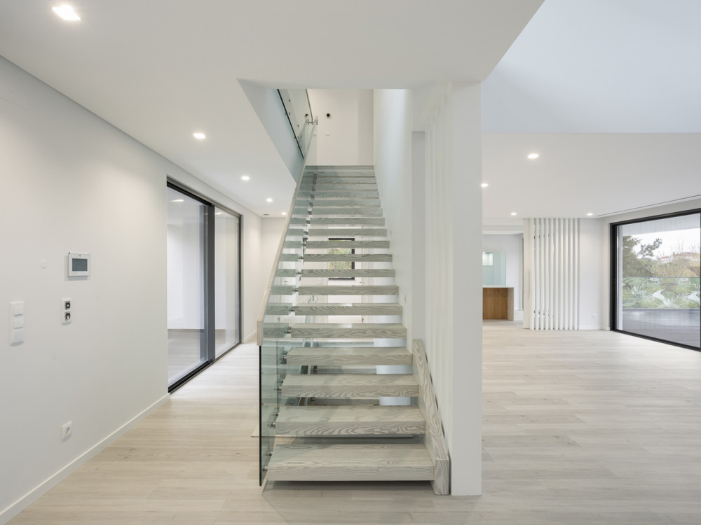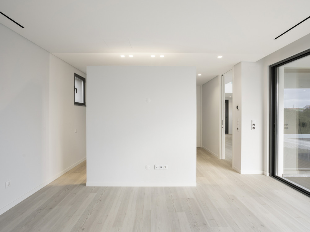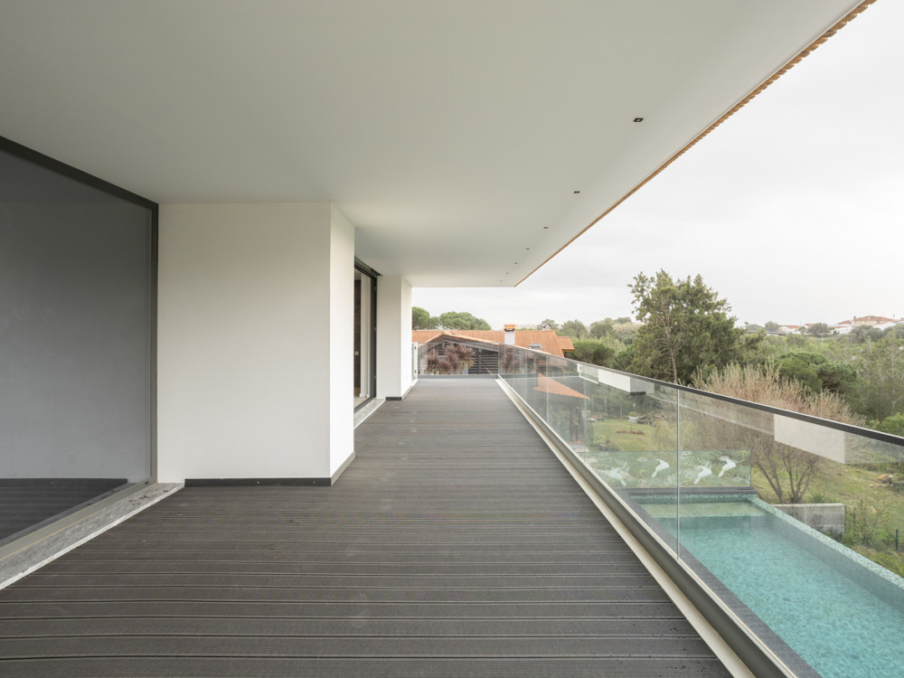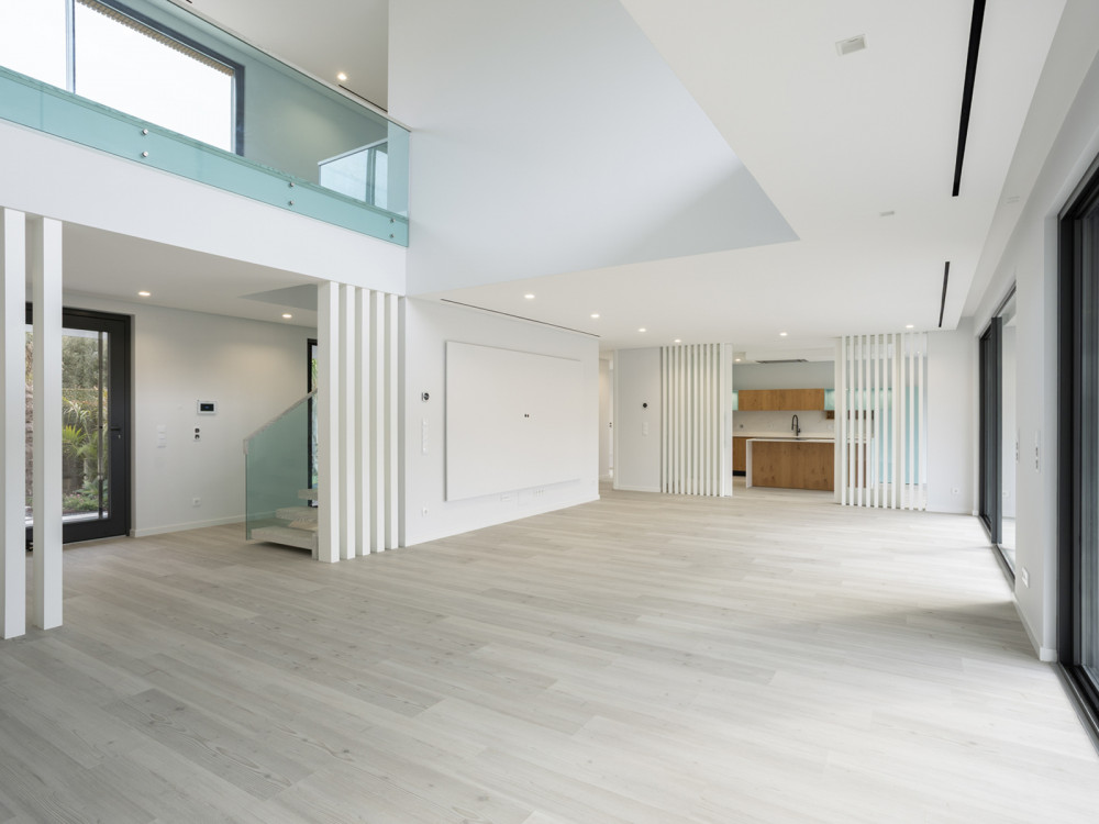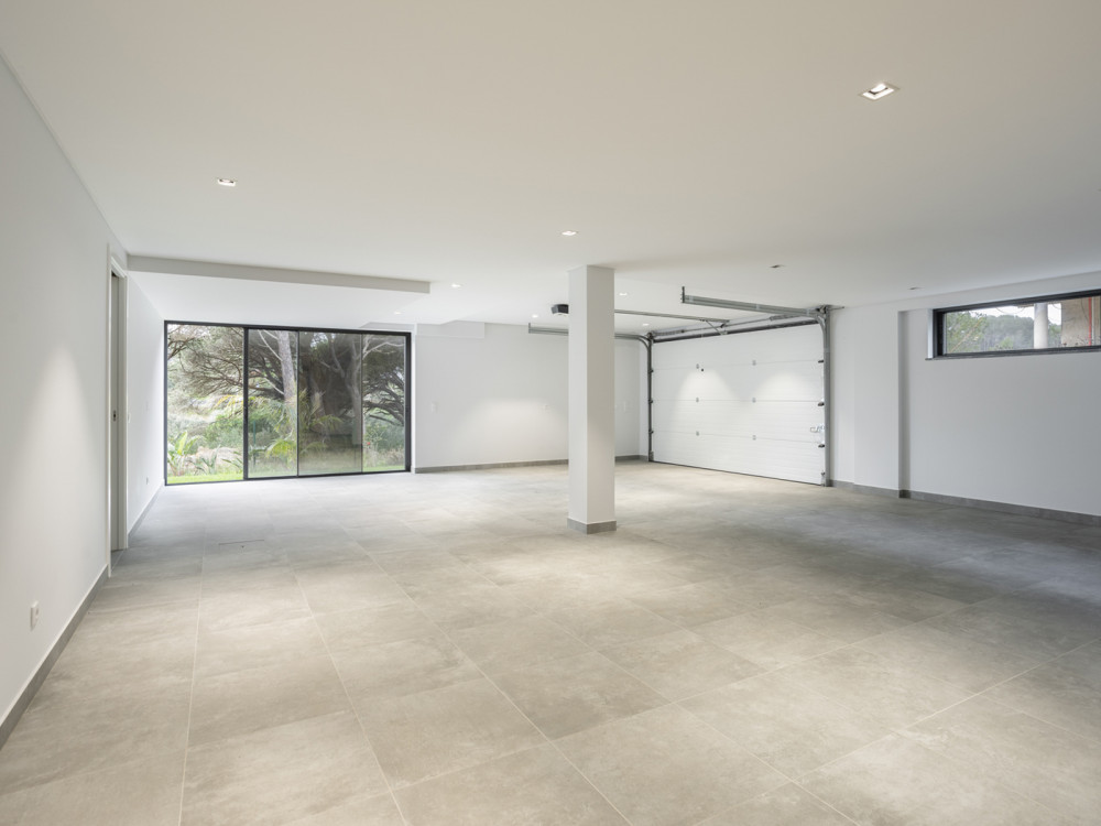 Outside, the lawned garden surrounds the swimming pool and the leisure area with covered barbecue. The closed garage, with 93 m², has capacity for four vehicles. The villa is equipped with central air conditioning, solar panels, controlled mechanical ventilation, boiler for domestic hot water, alarm system, video intercom, automatic irrigation and outdoor lighting. The south/east/west solar orientation ensures brightness throughout the day.