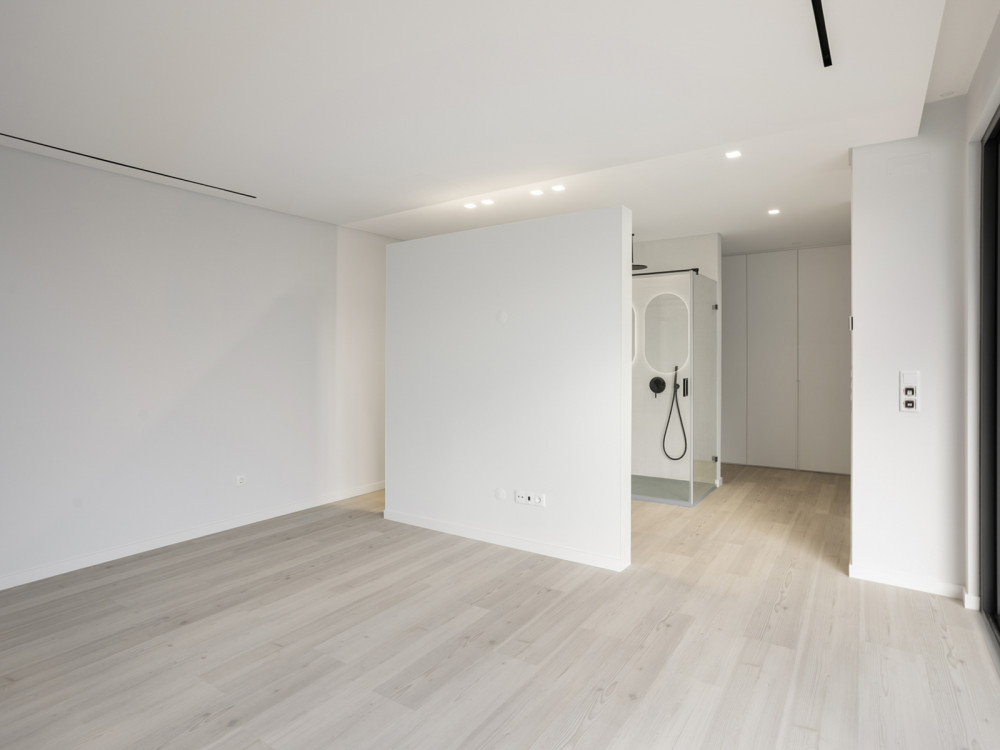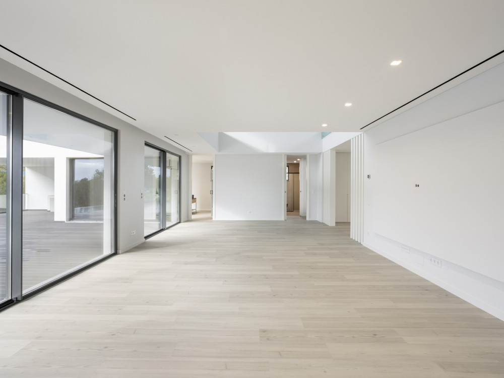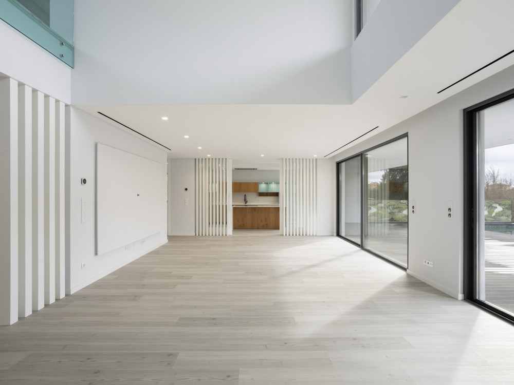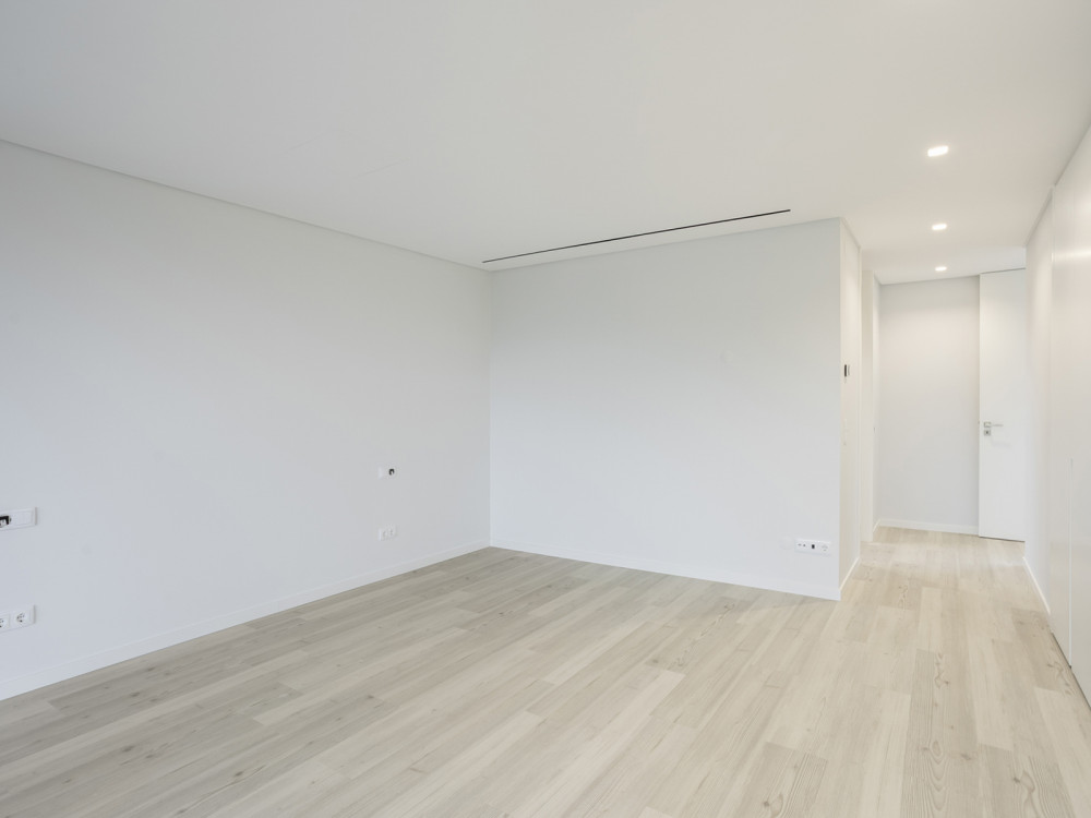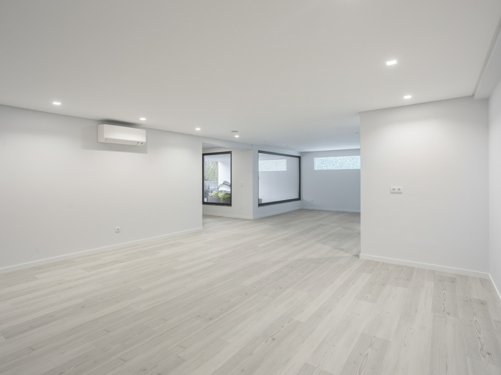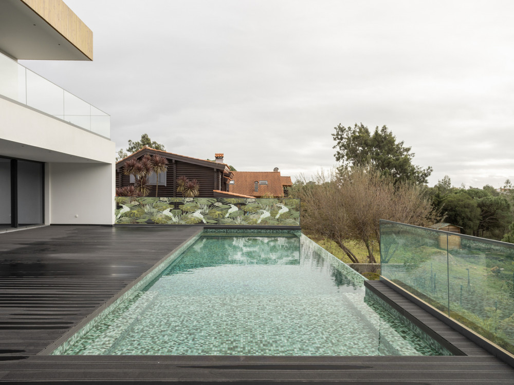 Outside, the lawned garden surrounds the swimming pool and the leisure area with covered barbecue. The closed garage, with 93 m², has capacity for four vehicles. The villa is equipped with central air conditioning, solar panels, controlled mechanical ventilation, boiler for domestic hot water, alarm system, video intercom, automatic irrigation and outdoor lighting. The south/east/west solar orientation ensures brightness throughout the day.