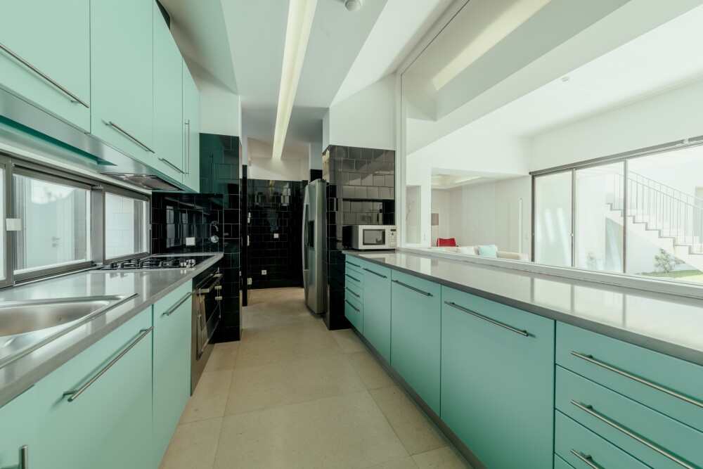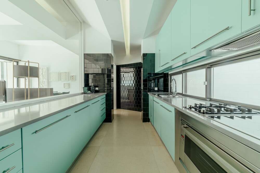 The living room can be seen from the 16 sqm kitchen through a large glass and the kitchen also has windows to an enclosed patio which allows natural light in.
