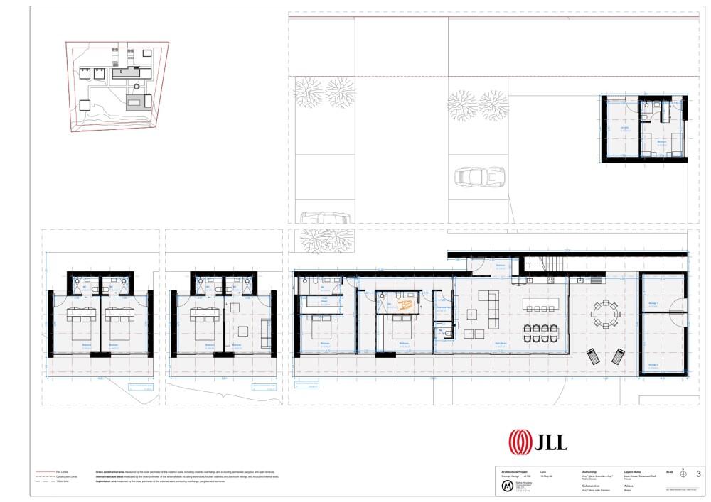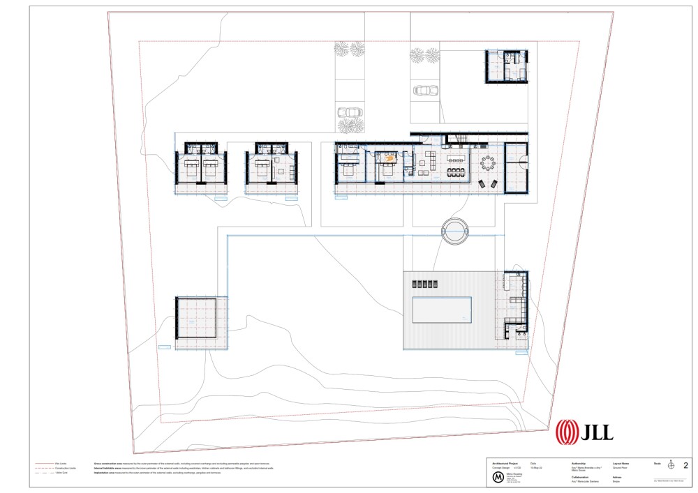 The project envisages the construction of a single-storey 7-bedroom villa, comprising a large living and dining room with American kitchen, covering a total of 61.61 sqm in open plan, six suites, one of which with a 5.40 sqm closet, and another with a bathroom adapted for people with reduced mobility, all with access to the outdoor terrace.