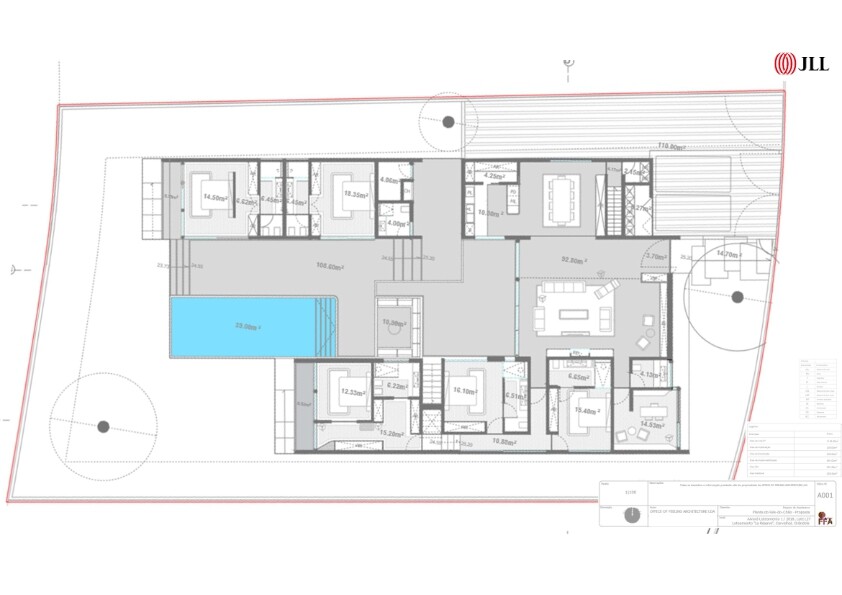 The planned villa comprises a large living and dining room with an American kitchen in a total of 111.98 sqm in open-plan, a guest bathroom, a home office and five suites, two of which with closet, and a master suite with a 40.72 sqm balcony.