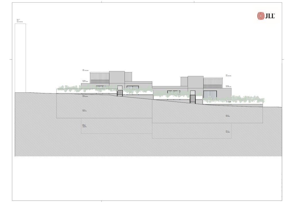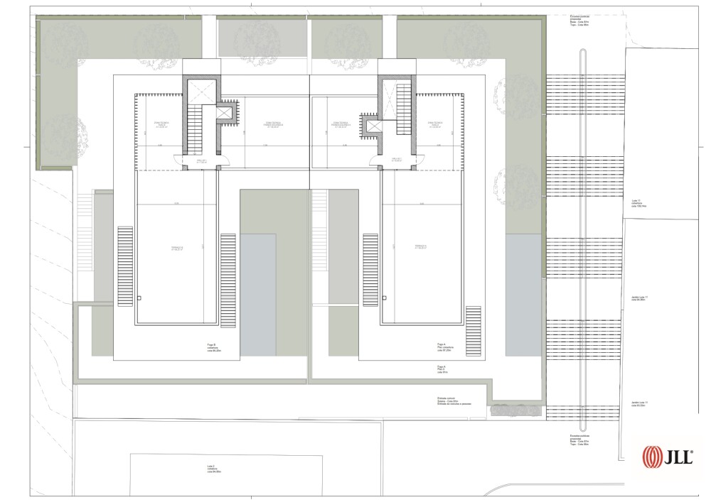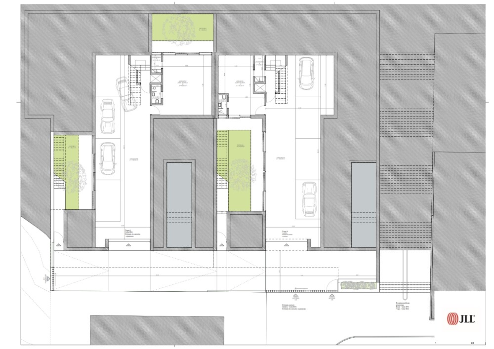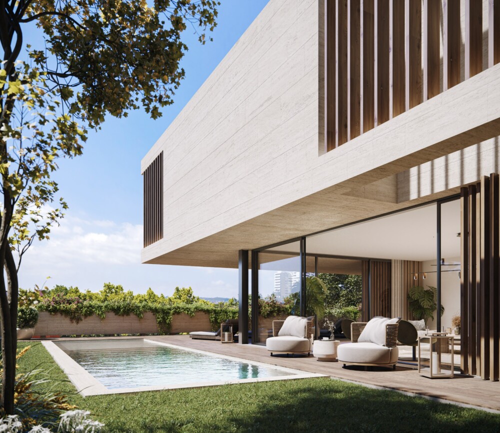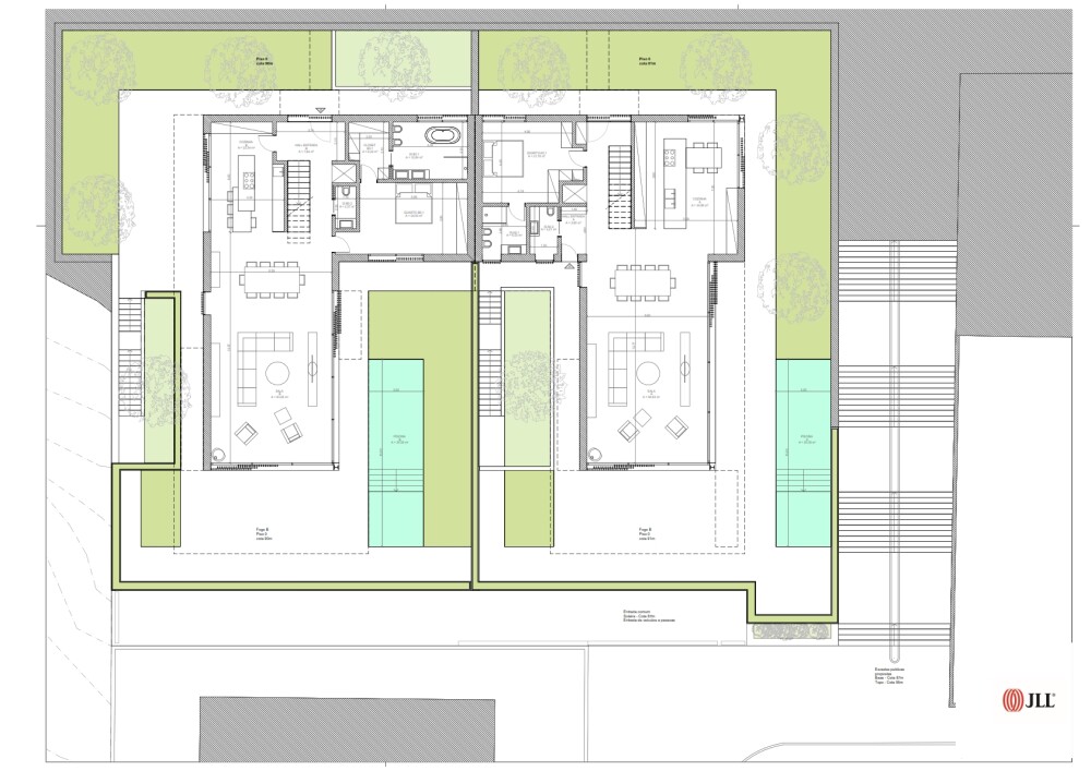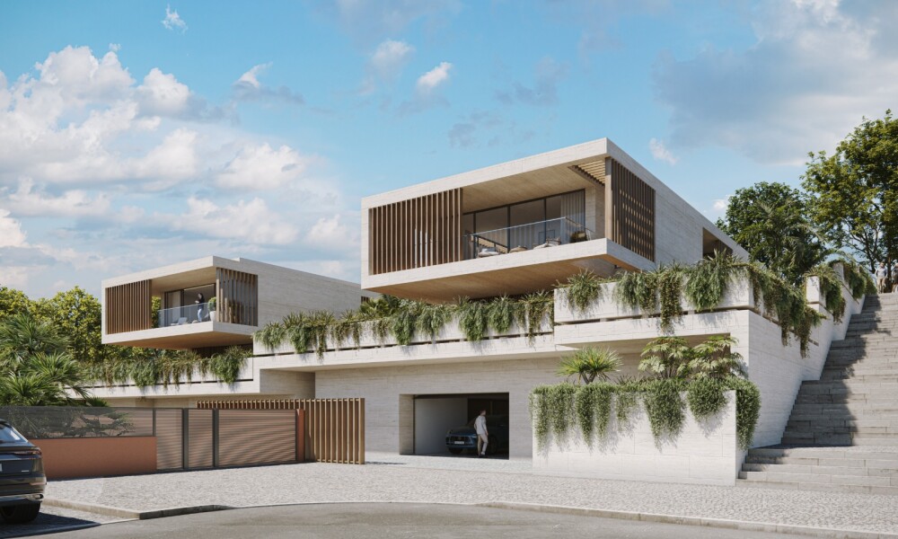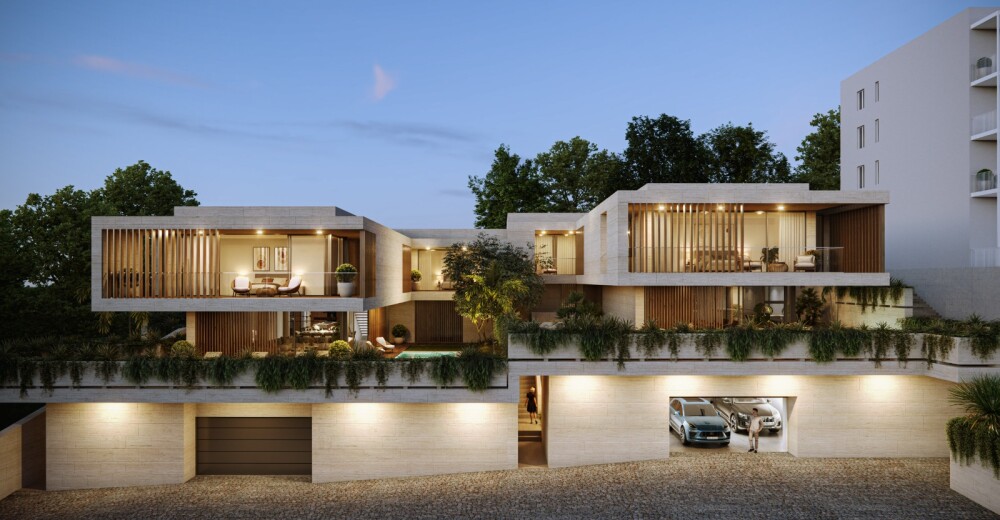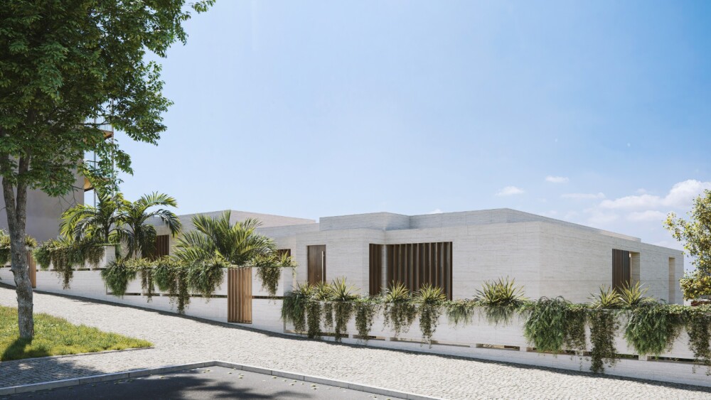 The architecture project, in the approval phase, includes the construction of two semi-detached houses with a T6 typology, with a 1-meter difference in height between them, each with two floors plus a semi-basement floor, pool, garden, private terraces, and a garage for four vehicles.