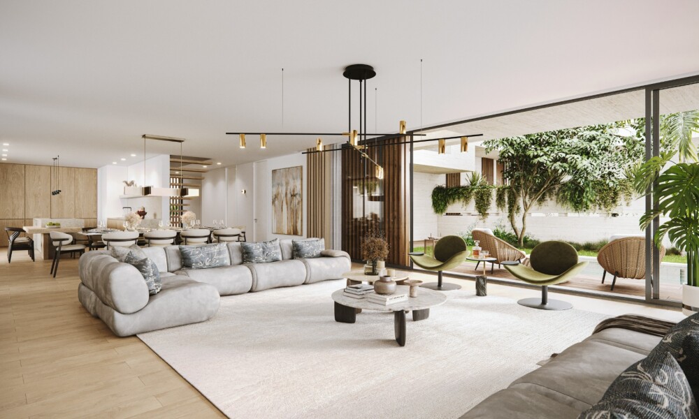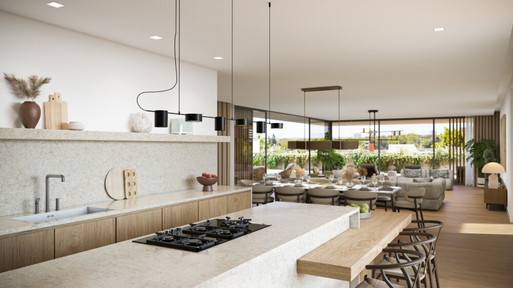 On the ground floor, there is the main entrance, a garden with access to the pool, and the social area of the house comprising a distribution hall with vertical access to the other floors, a living and dining room, an open-plan kitchen with an island, a guest bathroom, and a suite with a walk-in closet.
