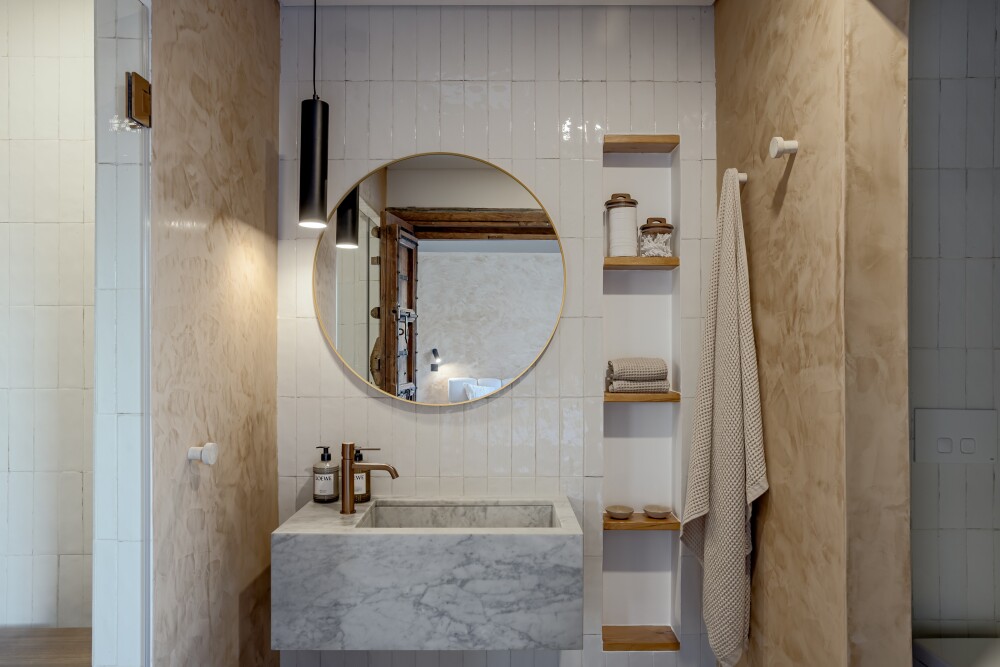 The finishes combine wood and concrete floors, plaster, stone, concrete and tile coverings, with exposed iron and wood structures and old wooden doors between rooms.