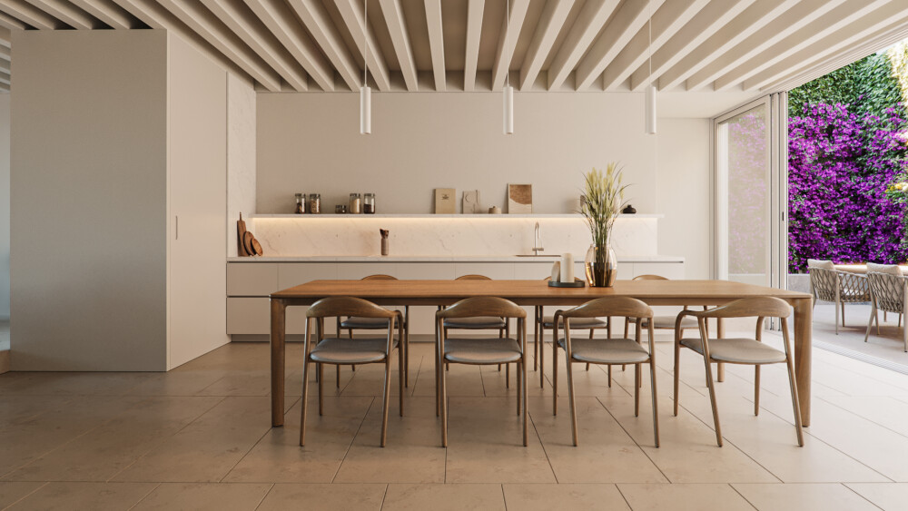 The ground floor is dedicated to common areas, including a 31 m2 dining room with integrated kitchen, 1.82 m2 guest bathroom, and 36 m2 living room.
