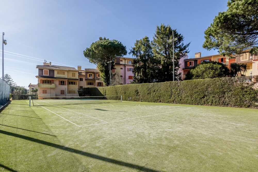 The condominium offers common areas, including a well-maintained garden, a pool, and a tennis court.