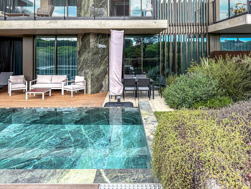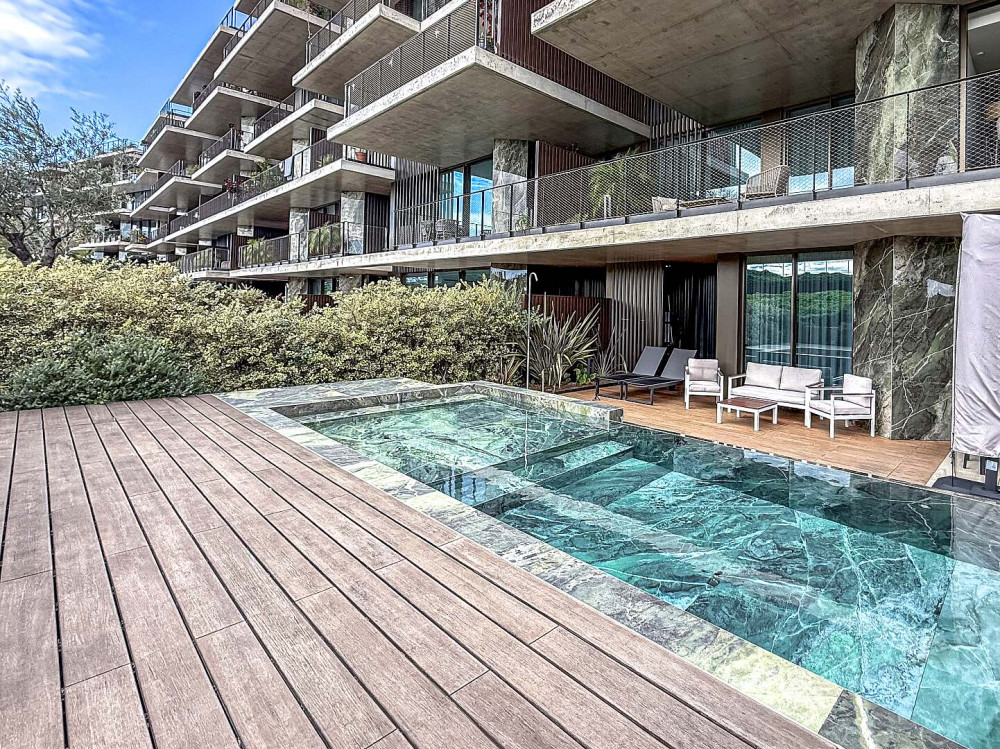 Outside, the property offers a spacious terrace with a private swimming pool, providing a true private retreat for leisure and relaxation. Elegant steps lead directly to the communal areas and the shared swimming pool, allowing residents to enjoy the resort-style amenities while maintaining a high level of privacy.