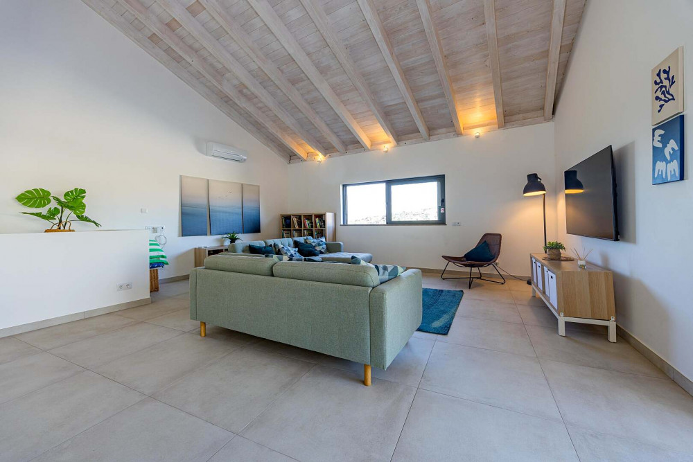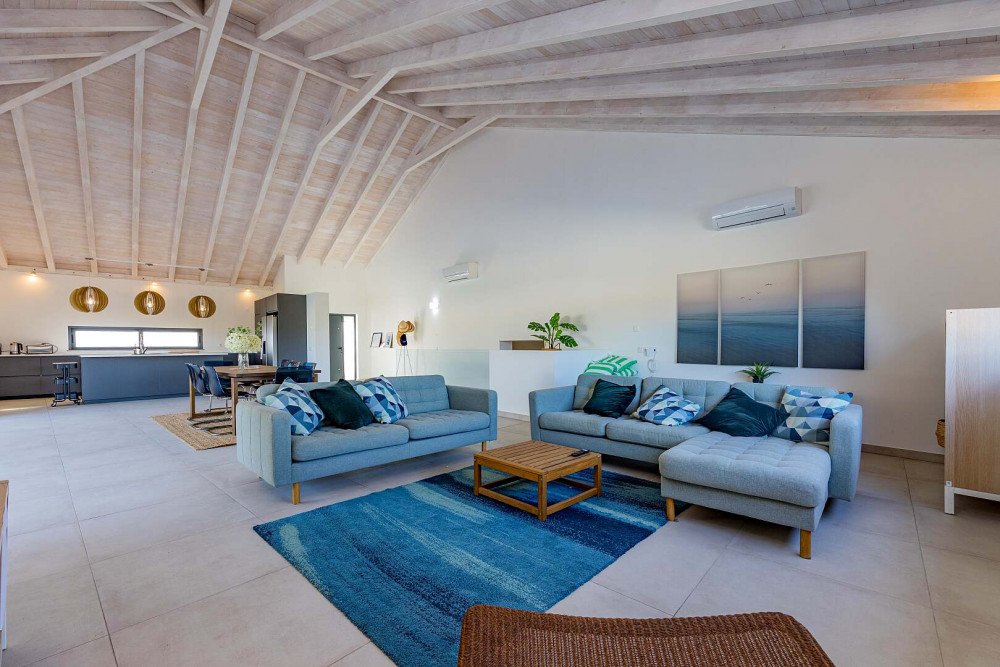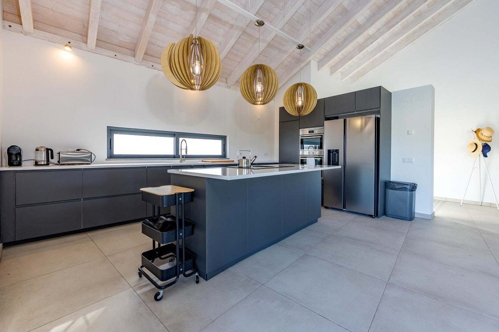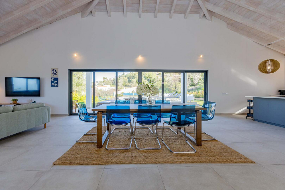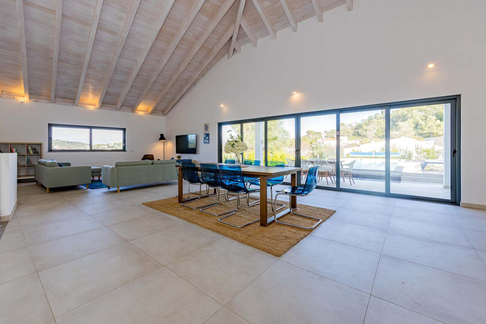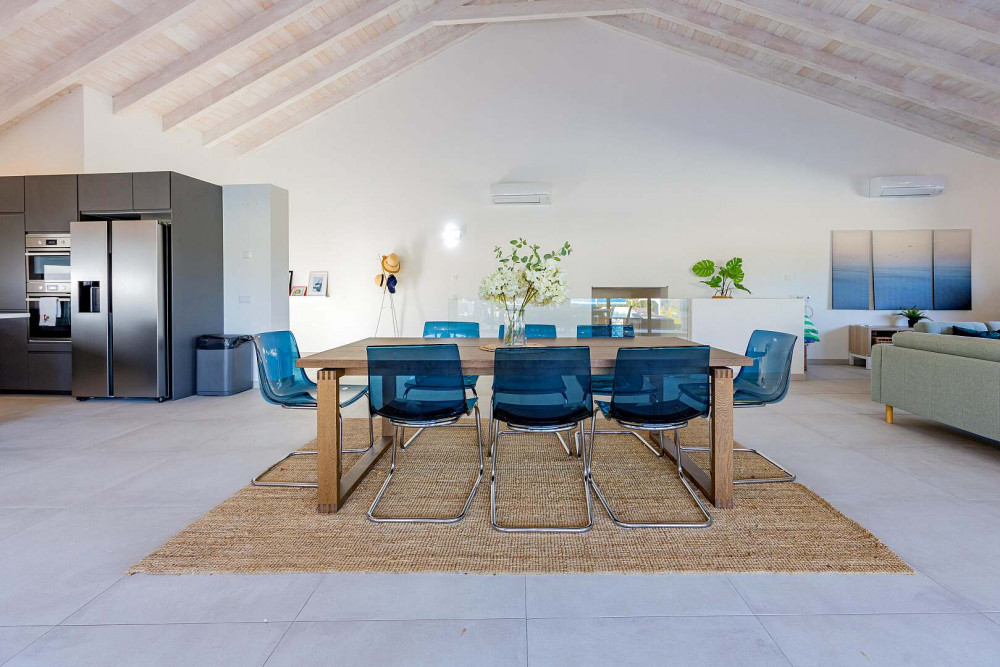 At the heart of the property lies an impressive open-plan living space of approximately 100 square metres, thoughtfully designed to connect the fully equipped kitchen, dining area, and lounge into one fluid and welcoming environment. A striking vaulted ceiling rising to seven metres enhances the sense of volume and natural light, while large sliding doors open directly onto the terrace and pool area, creating a seamless indoor-outdoor flow.