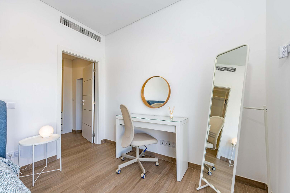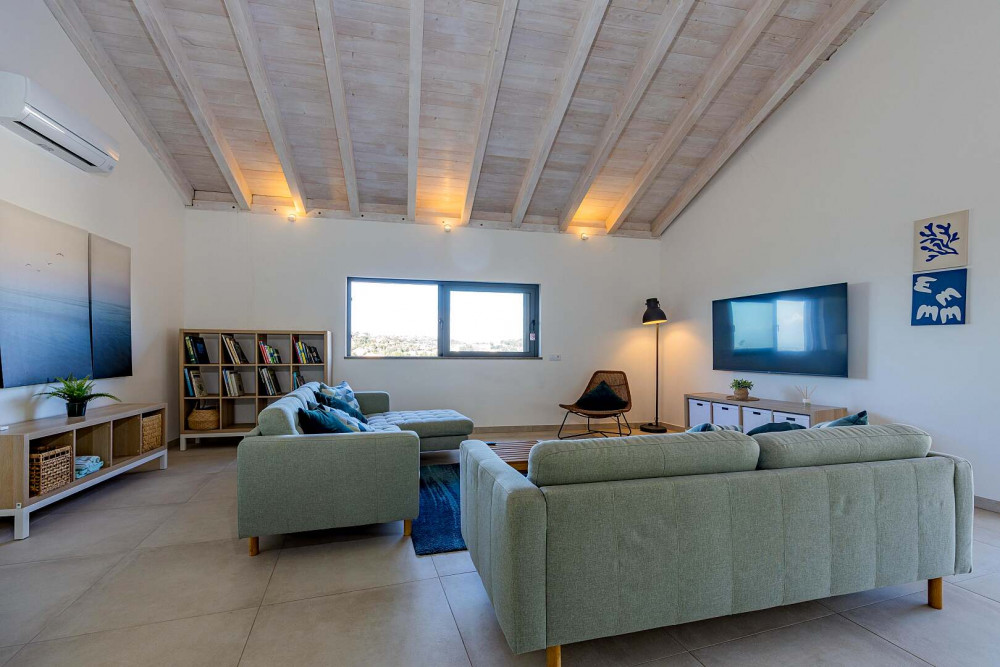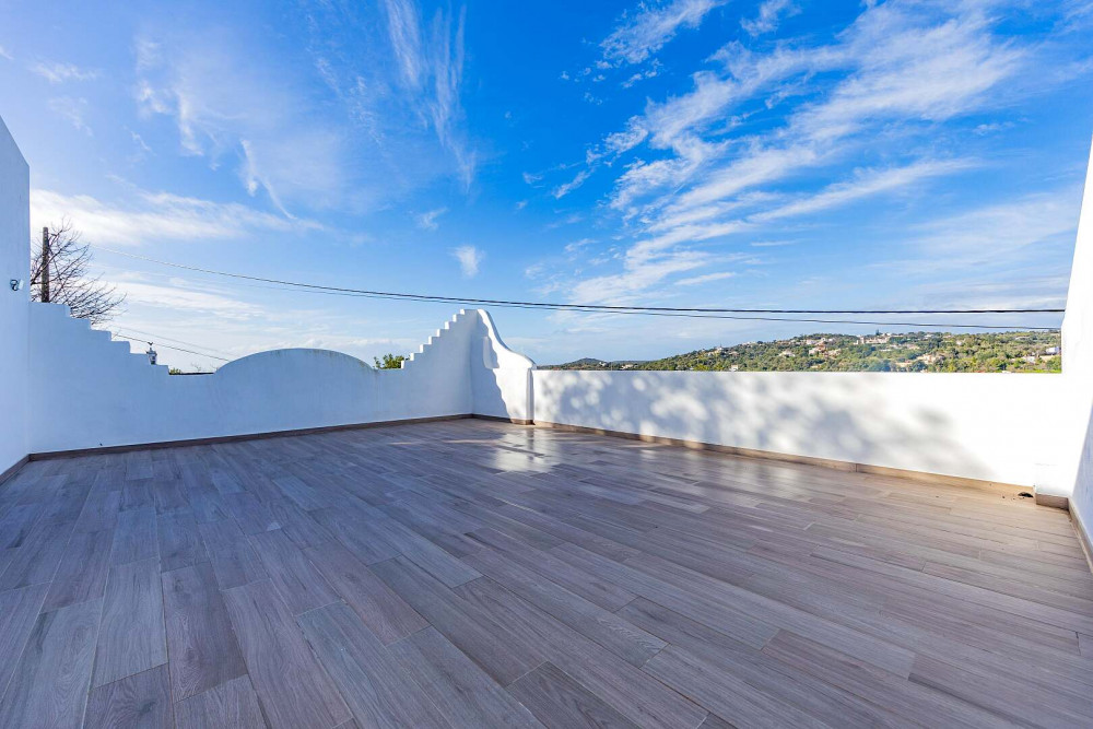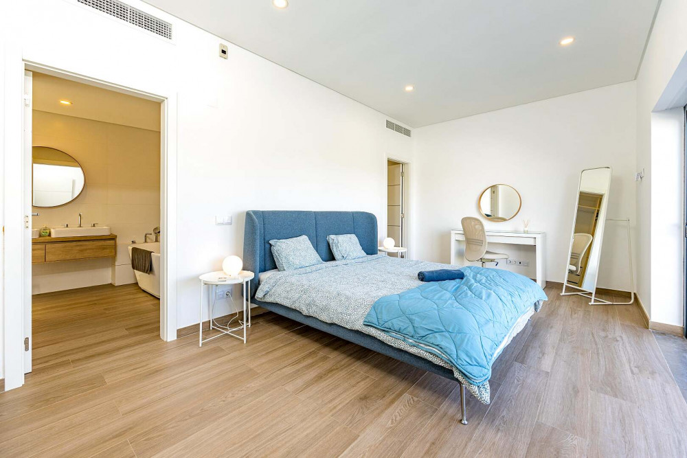 The villa offers four generously proportioned bedrooms, all en-suite, each fitted with built-in wardrobes and air conditioning. The principal suite provides an added layer of luxury, featuring a private dressing room and direct access to a spacious rooftop terrace of approximately 50 square metres, from which open views extend towards the sea.