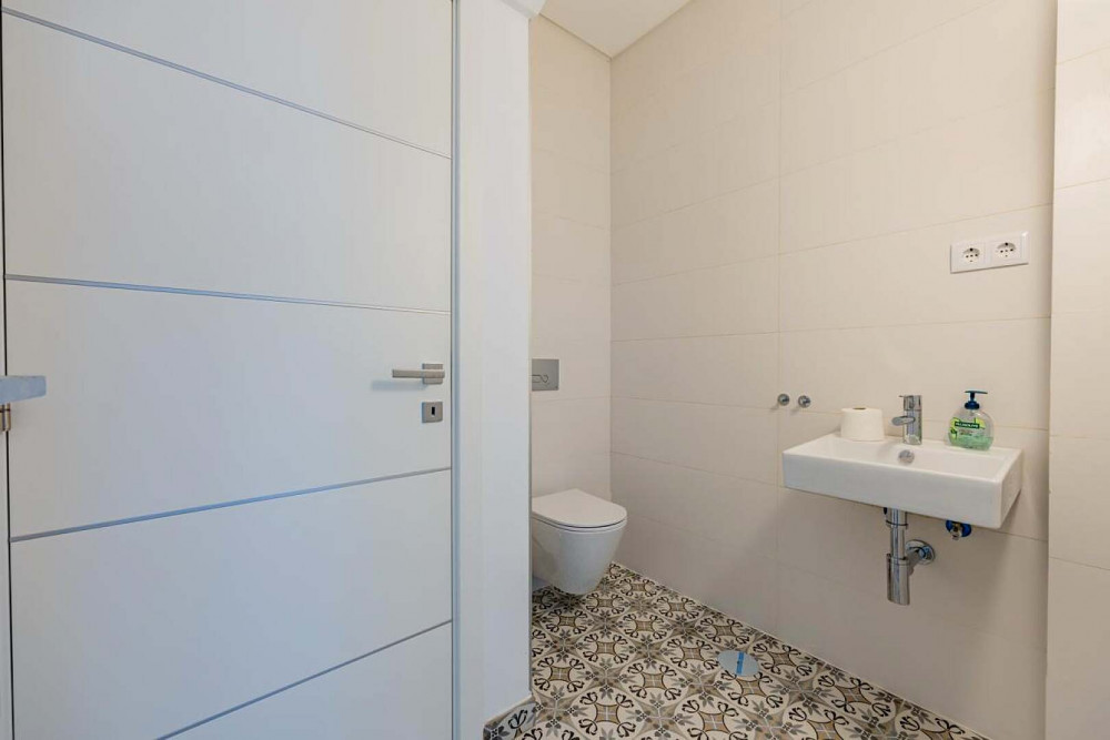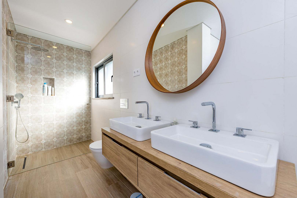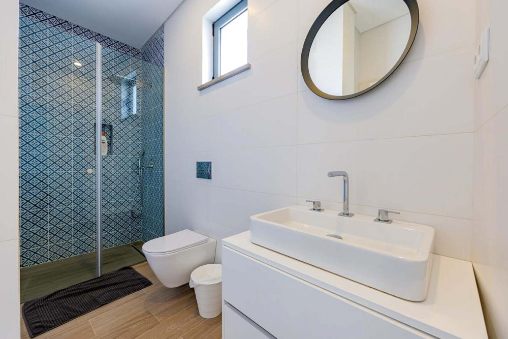 Subtle references to local craftsmanship appear throughout the home, including traditional hand-painted tiles used selectively in the interior and bathrooms, adding warmth and character to the contemporary design.