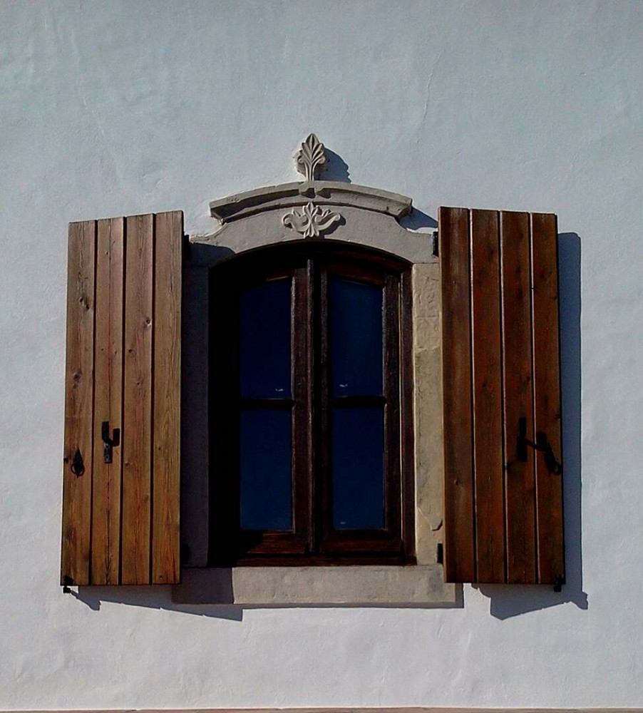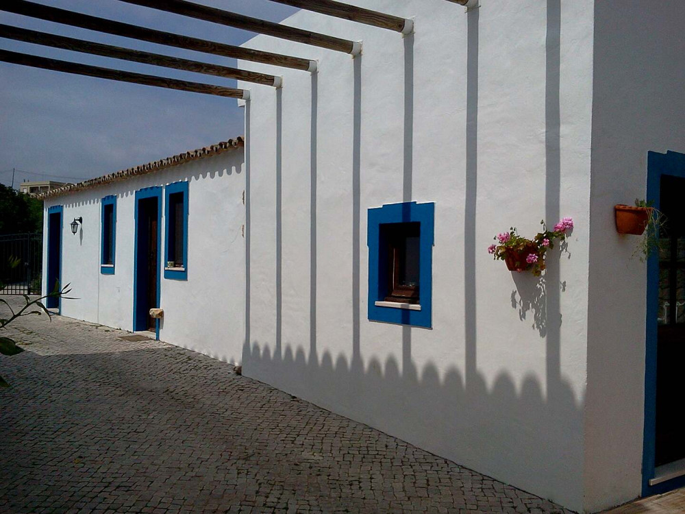 The exterior features traditional dry stone walls, a calçada (cobblestone) driveway, ladrilha patios, and whitewashed walls accented with Algarve blue trim. Original window and door surrounds remain intact, complemented by wood-framed windows and interior/exterior shutters.