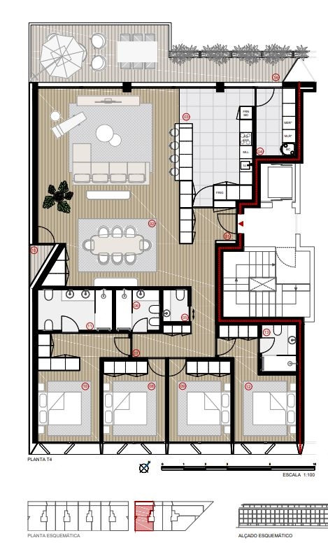 GENERAL ASPECTS STRUCTURE executed in reinforced concrete with direct foundations, reticulated structure of pillars and beams, with solid slabs, calculated according to the regulatory standards in force, including safety against wind and earthquakes. EXTERIOR WALLS executed in Preceram type ceramic thermal and acoustic brick masonry, with air box and thermal/acoustic insulation. The interior walls will also be in ceramic brick. FLOORS with lightweight concrete fillings to enclose all technical networks (water, sewage, electricity, telephones, gas and air conditioning networks). Application of polyethylene screen for acoustic insulation and regularization screed to support the final finish. Inverted flat roof, consisting of a light concrete pendant, waterproofing with double asphalt sheet, thermal insulation with extruded polystyrene “Roofmate” type, geotextile and mechanical protection with rolled pebble. EQUIPMENT / COMFORT Electric ELEVATOR with capacity for 8 people, with silent, smooth and energy efficient operation - Class A, with automatic doors and LED lighting; HEATING and COOLING by multisplit system with LG Deluxe indoor wall units, or equivalent. HEAT PUMP for Ariston sanitary water heating, or equivalent. FRAME in aluminum with thermal cut type Cortizo Cor Vision and Cor 60, with lacquered finish, including double glazing with thermal solar protection. BLACK-OUTS Sanca to allow the installation of blackouts or curtains from the inside. Includes provision of motorized blackouts in rooms; Mechanical and independent VENTILATION in kitchens and sanitary installations; INSULATION with polyethylene acoustic screen between the floors of the dwellings. Acoustic insulation w/ Mineral wool on the walls between fractions and thermal insulation on the outer walls with extruded polystyrene; VIDEO color intercom; Hydraulic INSTALLATIONS, Electricity, Telephones, TV and Natural Gas. LIGHTING with indirect light moldings and spotlights on the ceilings; PRIVATE PARK with access to the basement through an automatic sectional gate with remote control; ECOPONTO on the access road to the enterprise for the selective collection of undifferentiated solid waste, glass, paper and packaging; CONDOMINIUM ROOM; OUTSIDE LANDSCAPING ARRANGEMENT in common areas, with water mirror, playground and outdoor living/leisure areas. SECURITY SECURITY DOOR at the entrance to the Houses; FIREPROOF DOORS in access to stairwells and basements; Fire and Carbon Monoxide Detection System in garages; Fire fighting system in common areas Automatic lighting system activated by motion sensors and emergency lighting in common areas. CCTV system in common areas Rch and Caves; ENTRANCE HALL FLOOR: Oak wood, multilayer with final layer of noble wood; BASEBOARD: water-repellent white enameled MDF with fin; WALLS: Plastering with Seral type designed stucco; CEILING: 13mm thick plasterboard. KITCHEN FLOOR: Ceramic 60x60 Emotions Ceramics Naos Blanco, or equivalent; WALLS: Plastering with Seral type designed stucco; CEILING: 13mm thick plasterboard, including moldings for lighting and curtains; COUNTERTOP: Base: Top and space between furniture with Black Angola Granite or Estremoz Ruivina Marble; Alternative with Silestone Branco Norte or Silken Pearl (Additional Value €2,100 T2/T3, €2,500 T4/T5); EQUIPMENT/OS: Ceramic hob, oven, microwave, dishwasher and BOSCH combi fridge or equivalent;