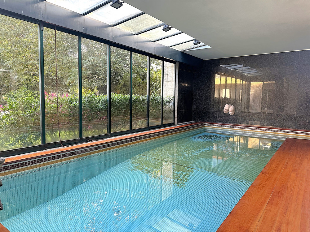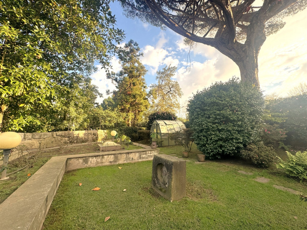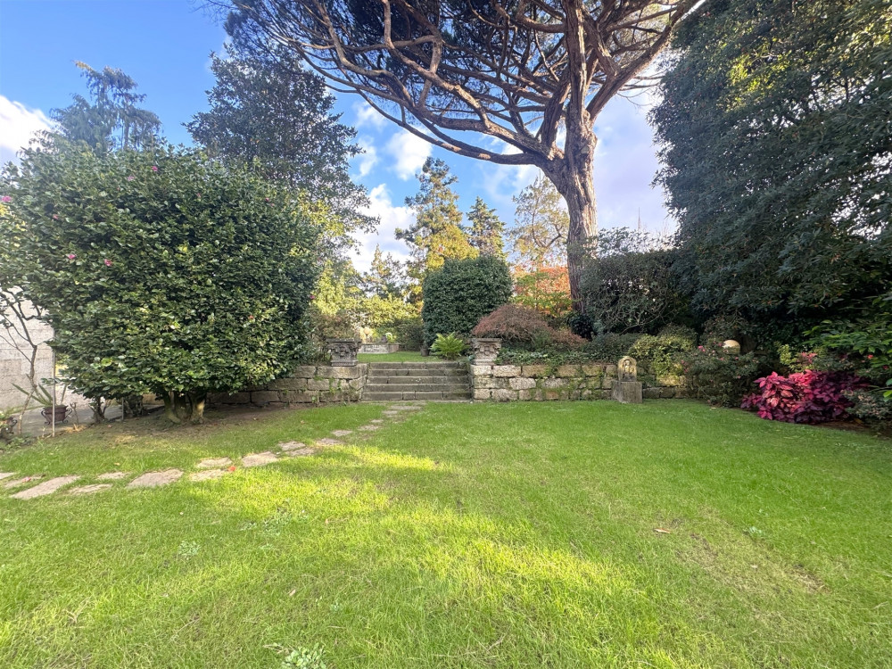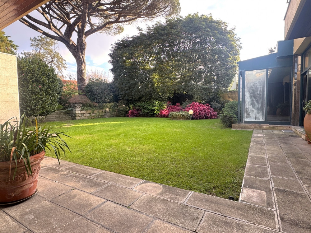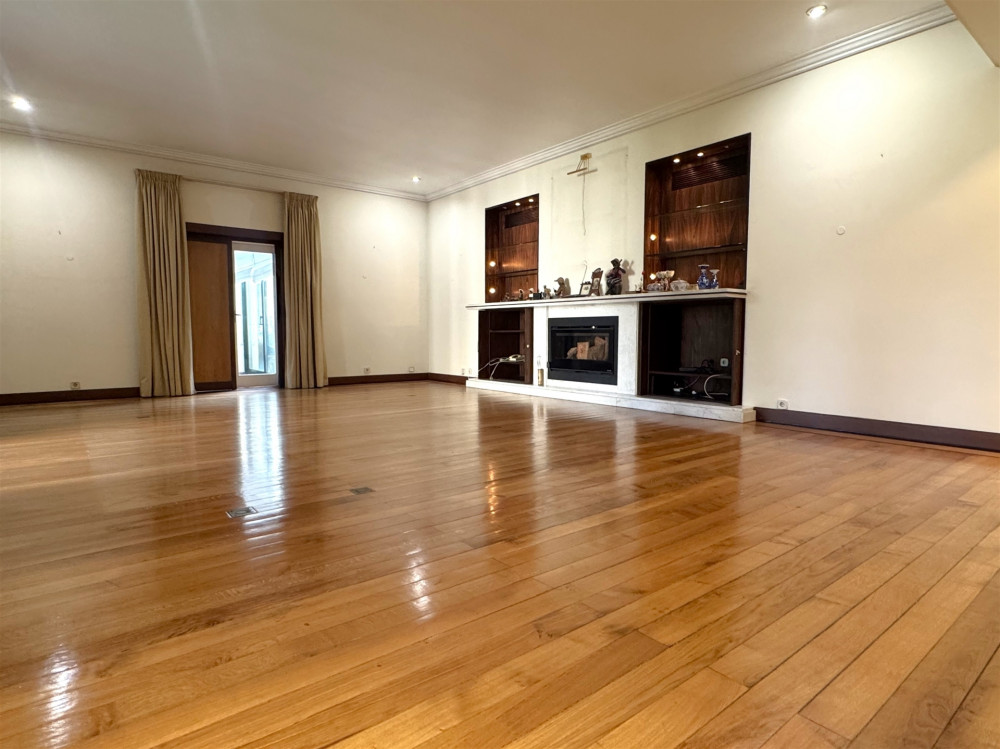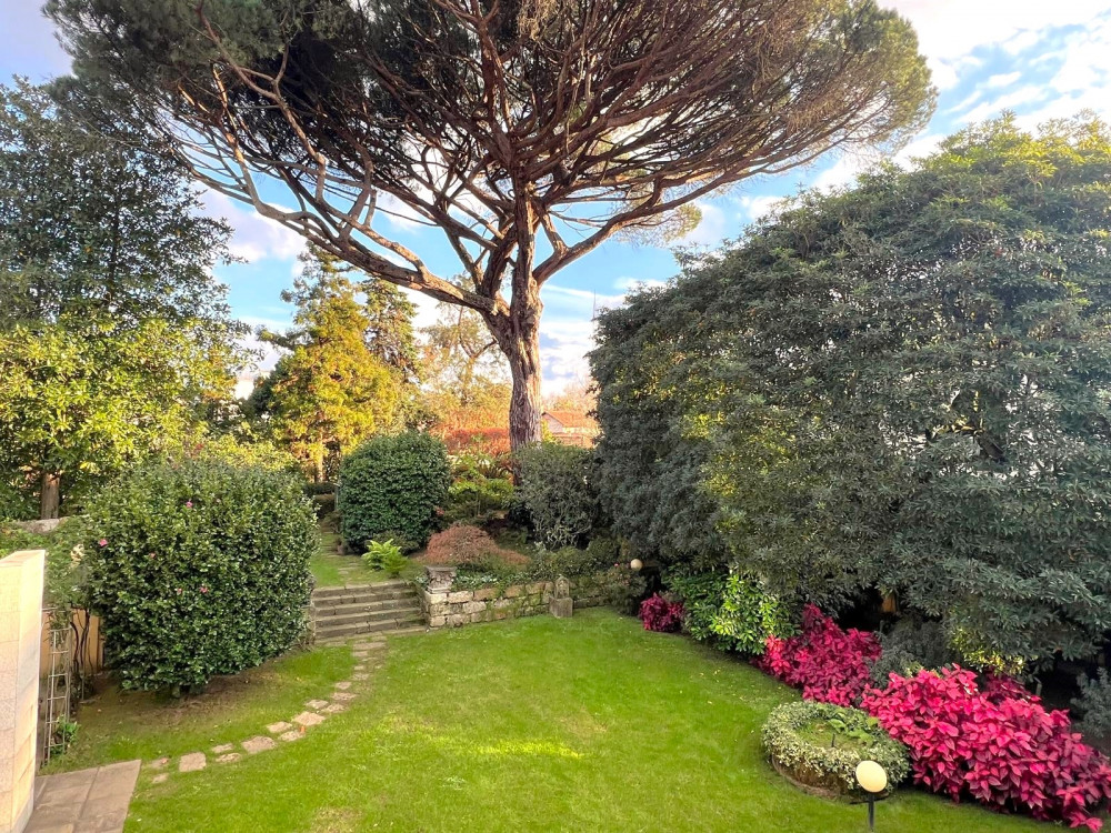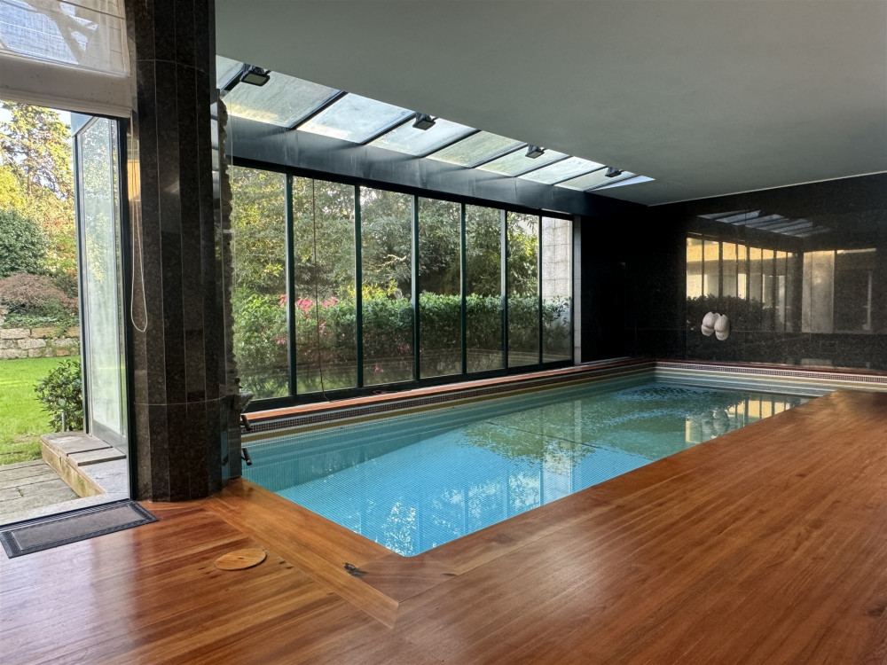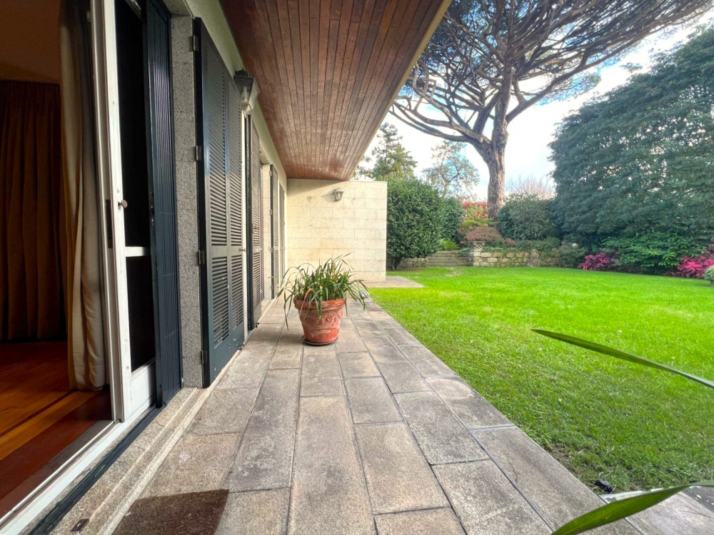 Ground floor - A very large entrance hall of around 80 m2 with access to the garden, a library/study, a huge living room with fireplace and access to the garden and an indoor swimming pool with dressing room and glass-enclosed bathroom also with access to the garden, after We have a kitchen, a good pantry, a service bathroom and a laundry room. This floor, with direct access to the beautiful garden with 1090 m2 all covered in grass, with stone paths, very well cared for, full of trees such as camel trees, oaks and a 7 meter high national heritage pine tree, also has an annex at the bottom of the garden that works as a T1 with a bedroom, a bathroom and a kitchen. The garden is enchanting with the various species and the sculptures you spread throughout it!