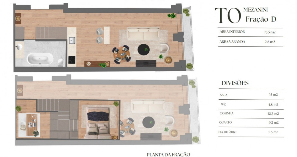 The 73m2 apartment, located on the 1st floor, is distributed in a common room with access to the 3m2 balcony, kitchenette and mezzanine bedroom.