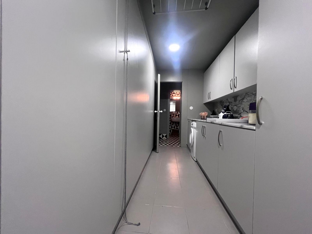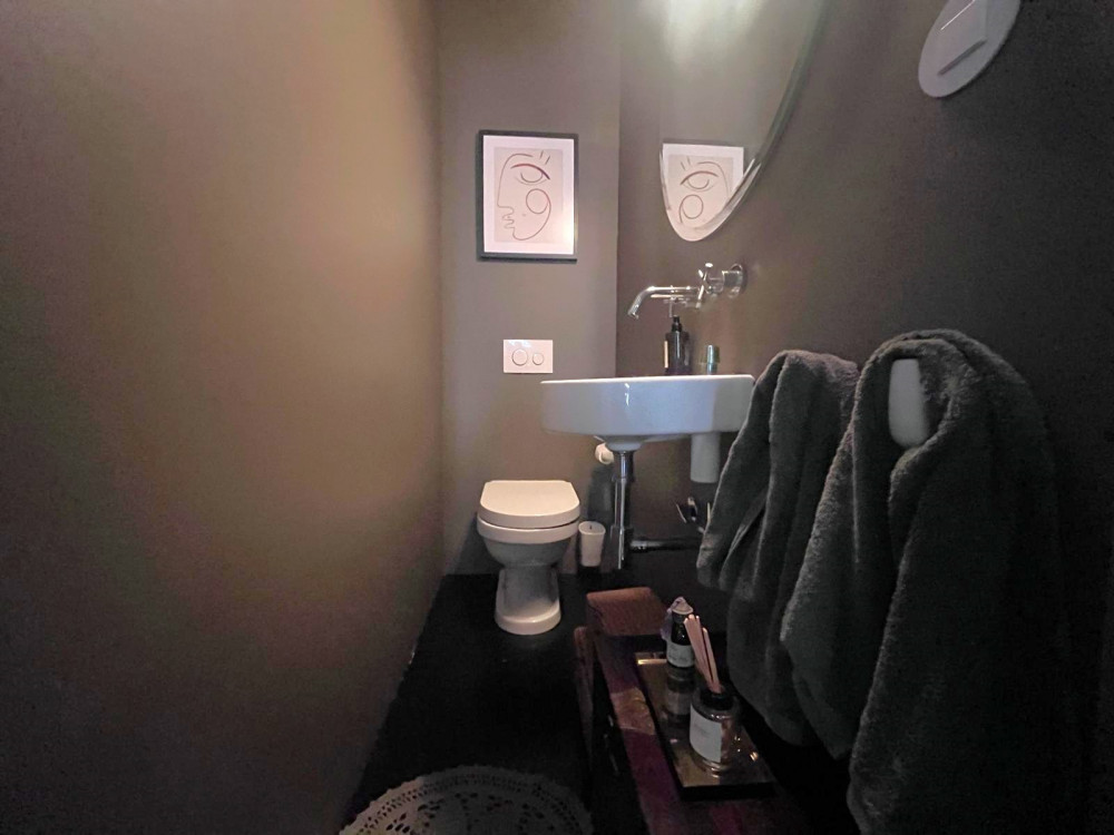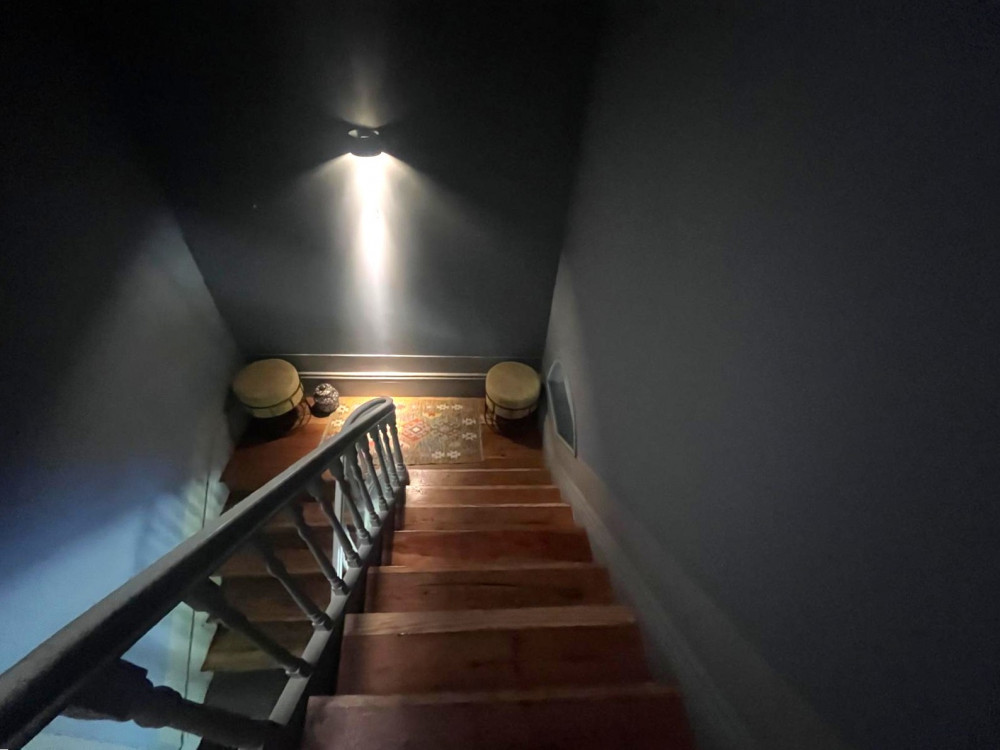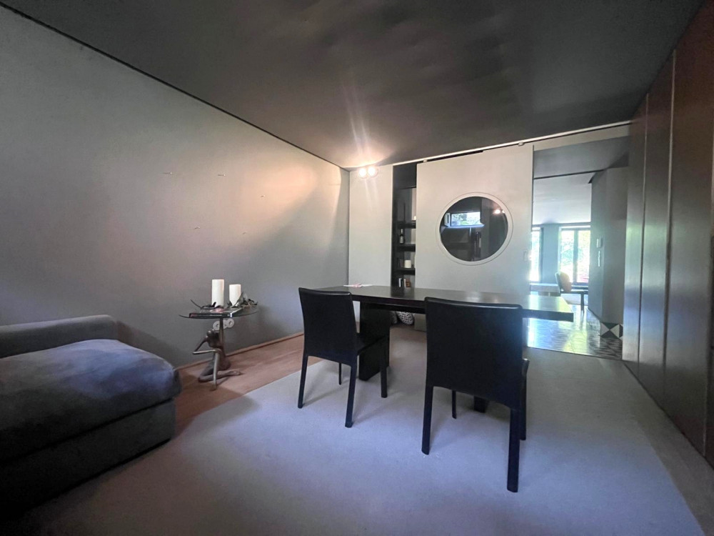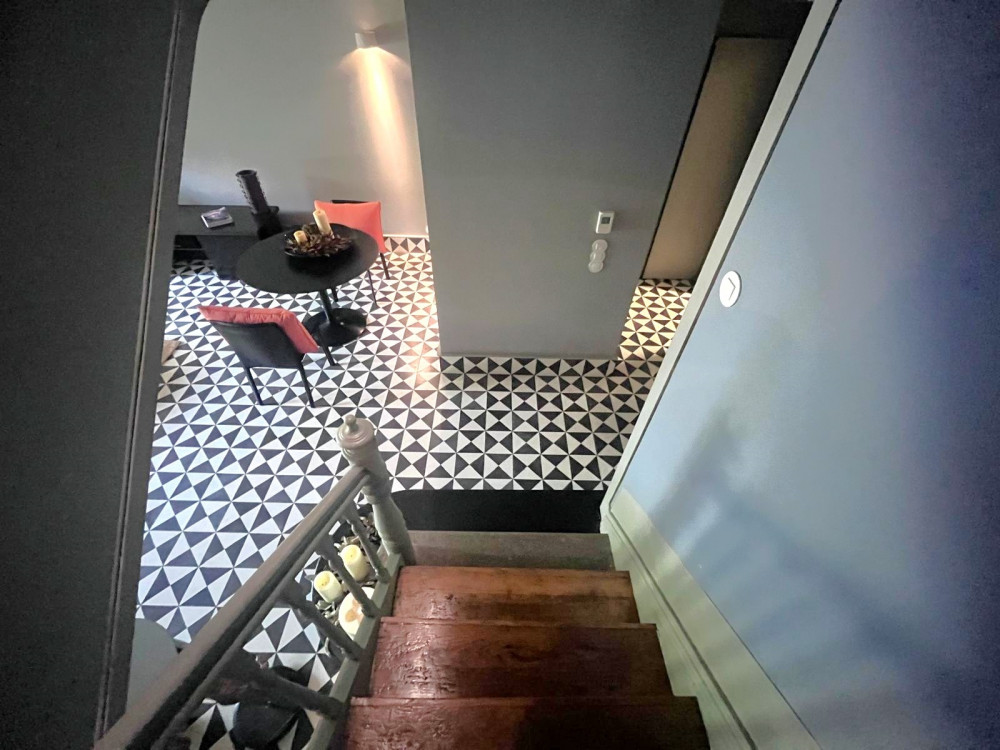 Floor 0 - Going down the stairs, we have a bedroom or office on the right, in front of us a very well-equipped laundry/kitchen, a bathroom and an open living room with direct access to the patio and garden.