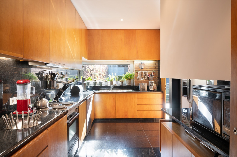 On the 1st floor, a living room (35.8 m2) opening onto the dining room area (18.15 m2) with access to the barbecue area and the garden; storage room, toilet and the kitchen (13.8 m2) equipped and with views and access to the garden, facing south.
