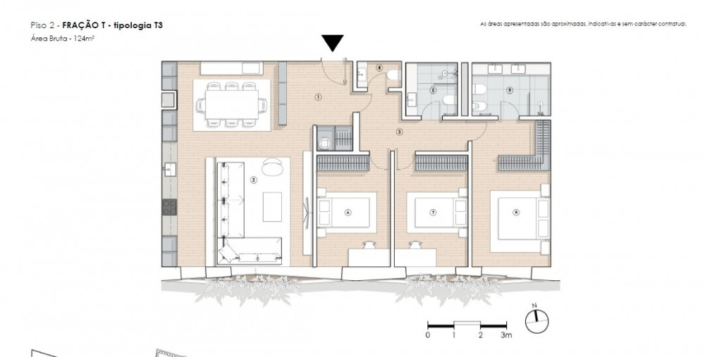 It features 124 m2, 3 bedrooms, one of which is a suite, 2 full bathrooms, a storage room, and two parking spaces.