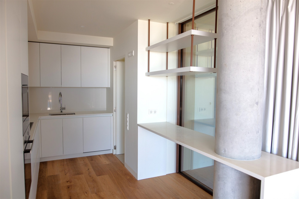 It comprises: entrance hall, a guest bathroom, a beautiful living room with a terrace with wonderful views over the river to the west that connects to a modern and equipped fully lacquered kitchen with a laundry area. After a corridor we have two great suites, one with a balcony and the other with a good terrace. Apartment with lots of natural light