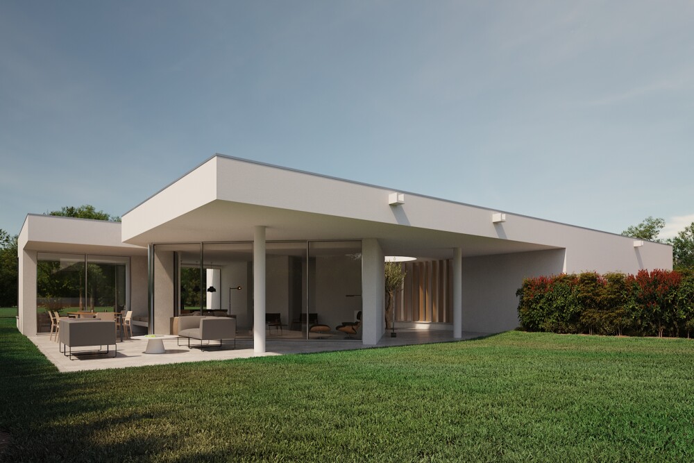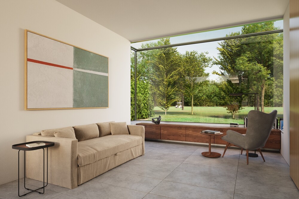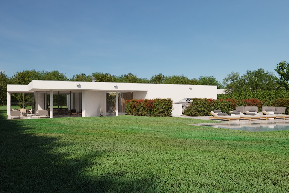 Designed by Architects Madalena Cardoso Menezes and Francisco Teixeira Bastos, the single-story house, with private garden and pool, enjoys a view of the golf course and garden.