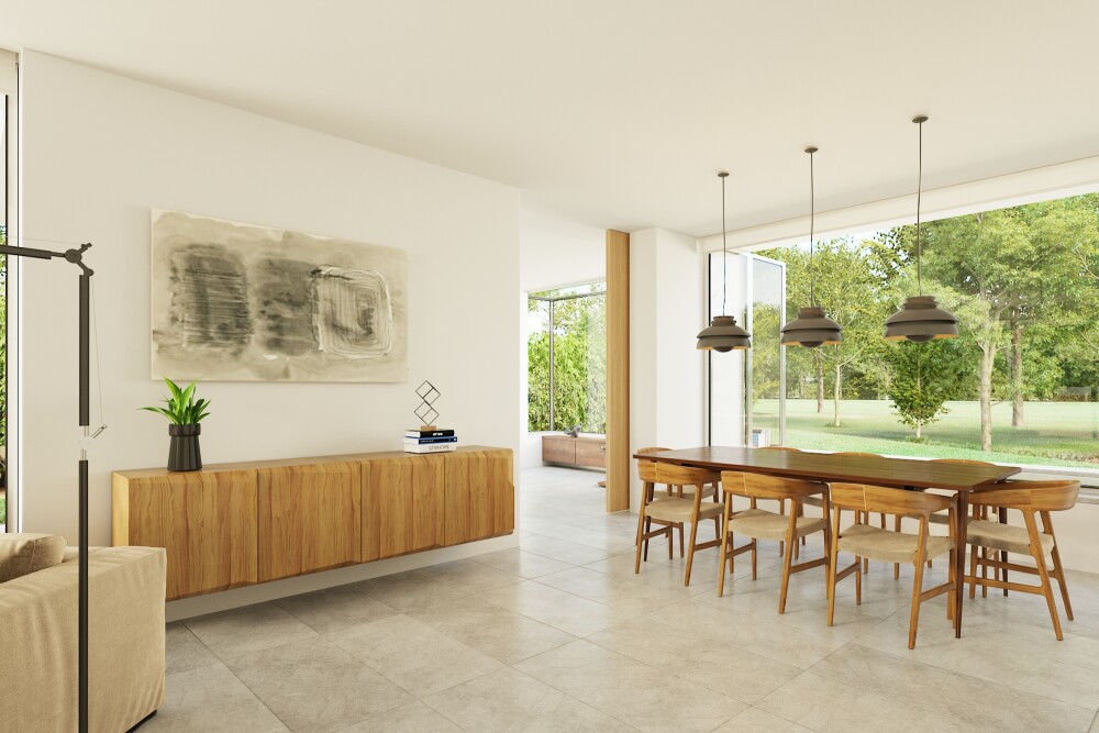 The very bright 55 m2 living room was designed to create distinct environments in a common space.