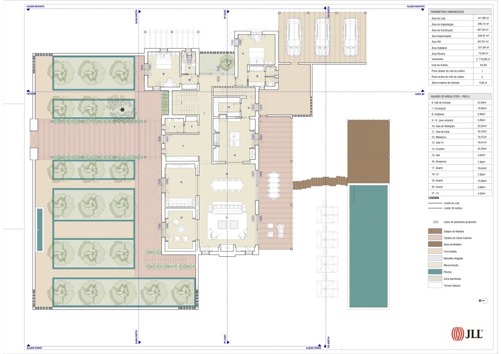 Outside, there is a covered terrace with a dining table in front of the living room, a wooden deck with a swimming pool, and covered parking.