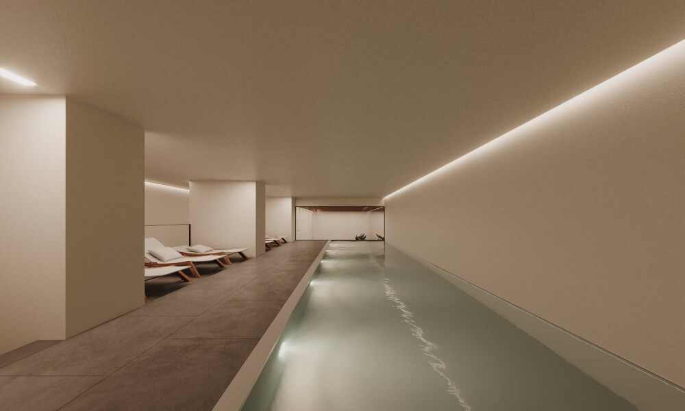 The common areas include an indoor swimming pool, sauna, and Turkish bath, supported by changing rooms, a gym, outdoor patio and coworking space.