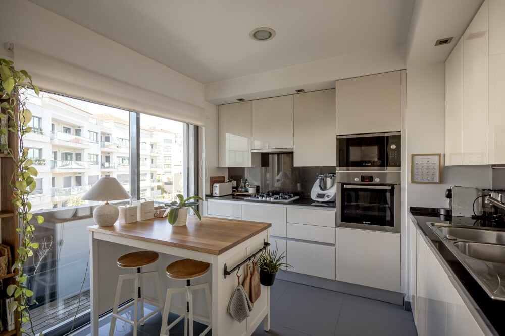 The apartment comprises a living room with access to the balconies, a fully equipped kitchen, a laundry room, two bedrooms, one of them en suite, and two bathrooms.