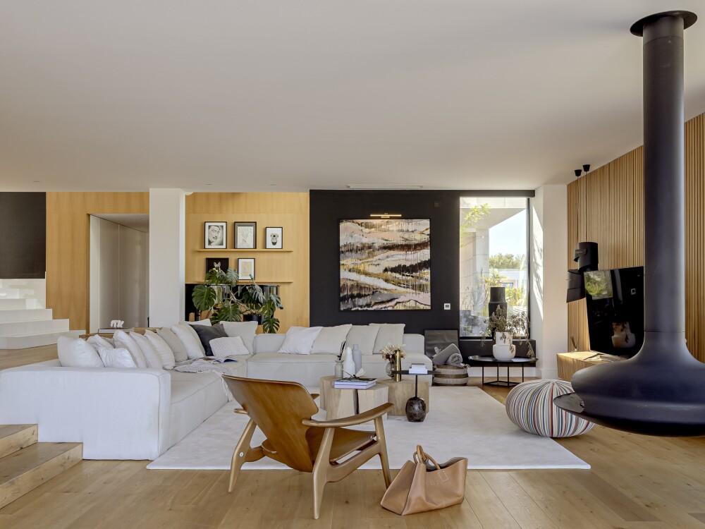 The upper floor features four en-suite bedrooms with walk-in wardrobes, one with an ethanol fireplace, a guest bathroom and a mezzanine used as an office.