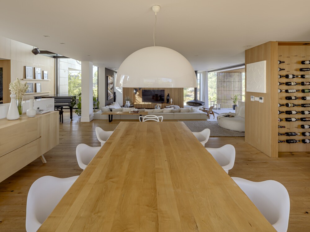 The entrance level comprises a spacious living room with suspended fireplace, dining room and fully equipped kitchen with SMEG appliances, including American-style refrigerator, two dishwashers and two ovens, pantry, wine cellar and a guest bathroom.