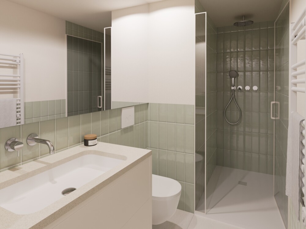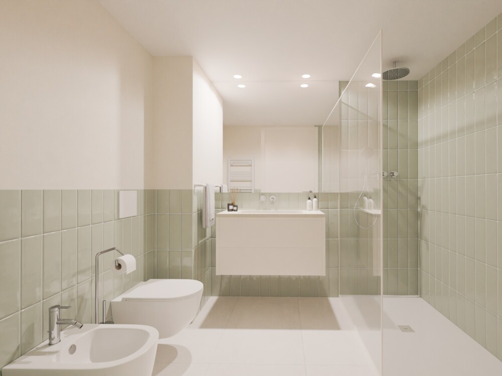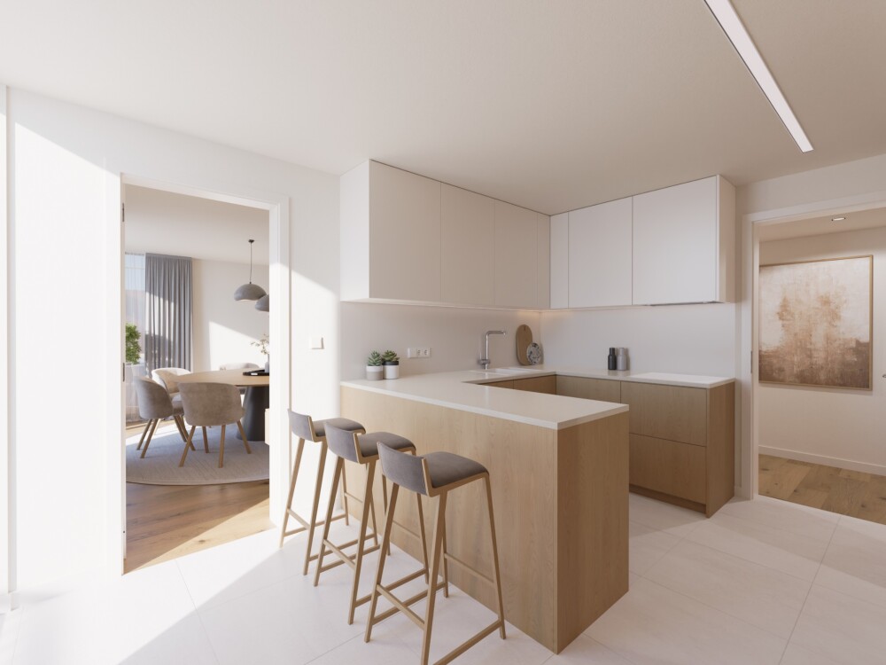 It has air conditioning, underfloor heating in the private bathrooms, parking with electric vehicle charging system, thermal cut aluminum frames with double glazing, plenty of natural light, and modern, functional interiors.