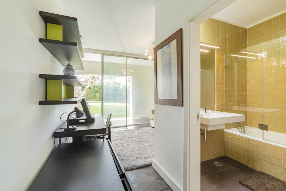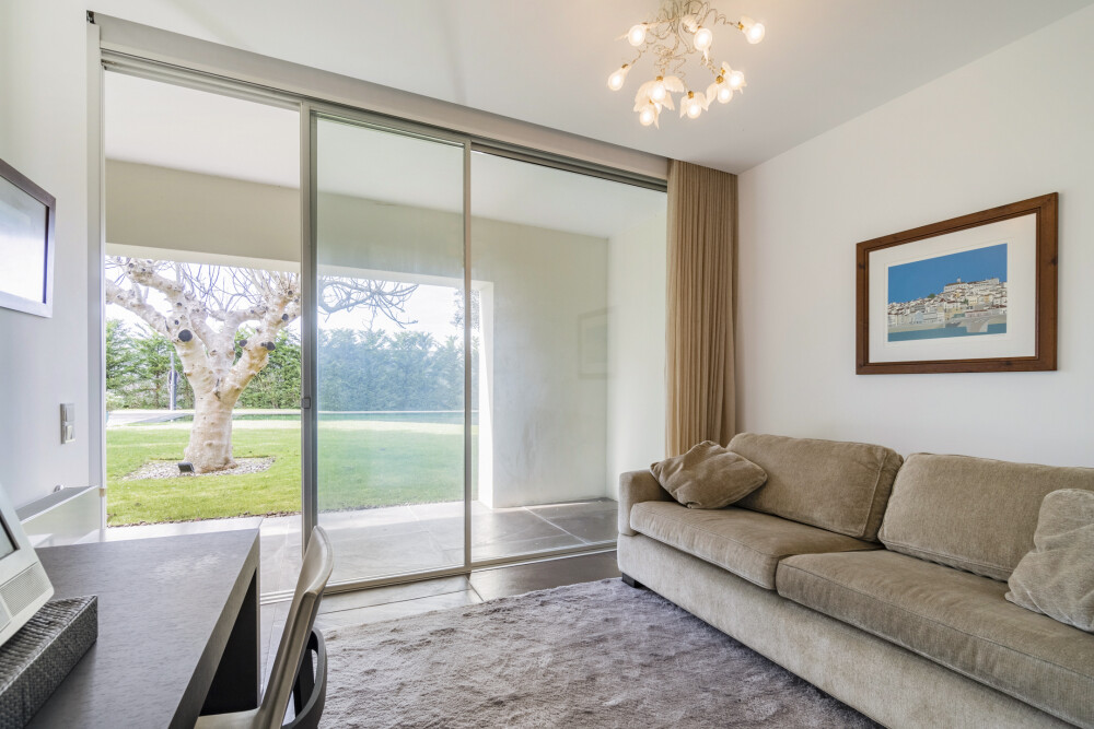 The living room with suspended fireplace has large French doors that allow natural light to enter and extend the space to the exterior where the private heated swimming pool and winter garden are located.