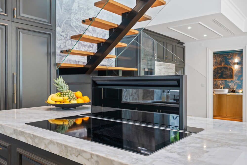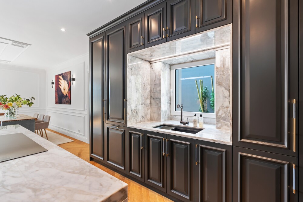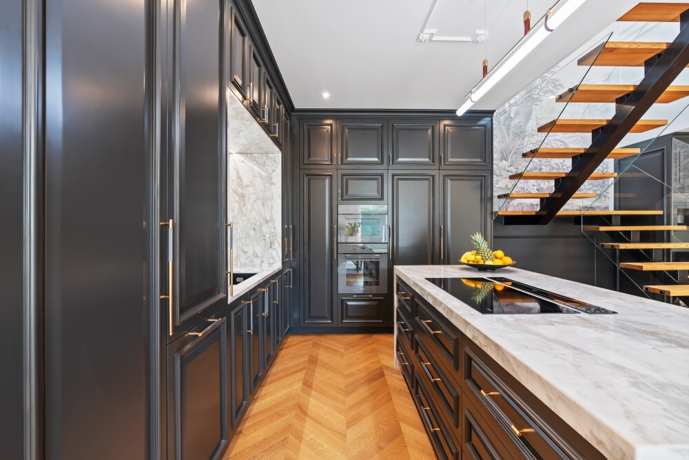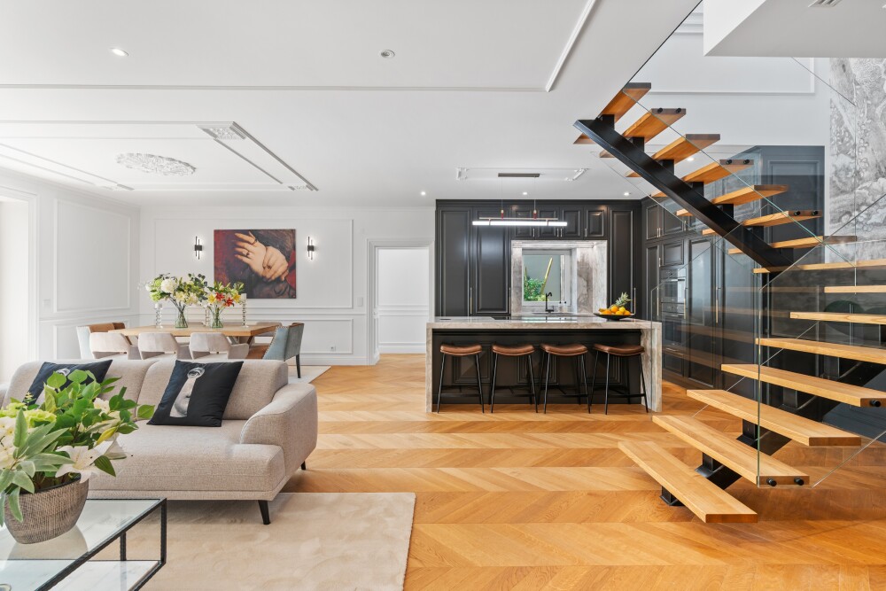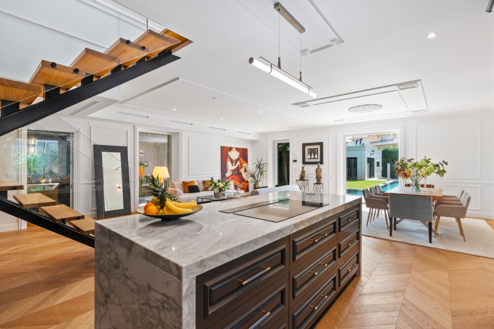 On the entrance floor, there is a living room with decorative ceilings, directly connected to a blue-toned kitchen that adds a modern touch.
