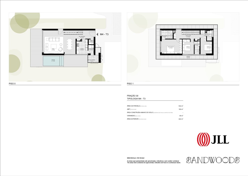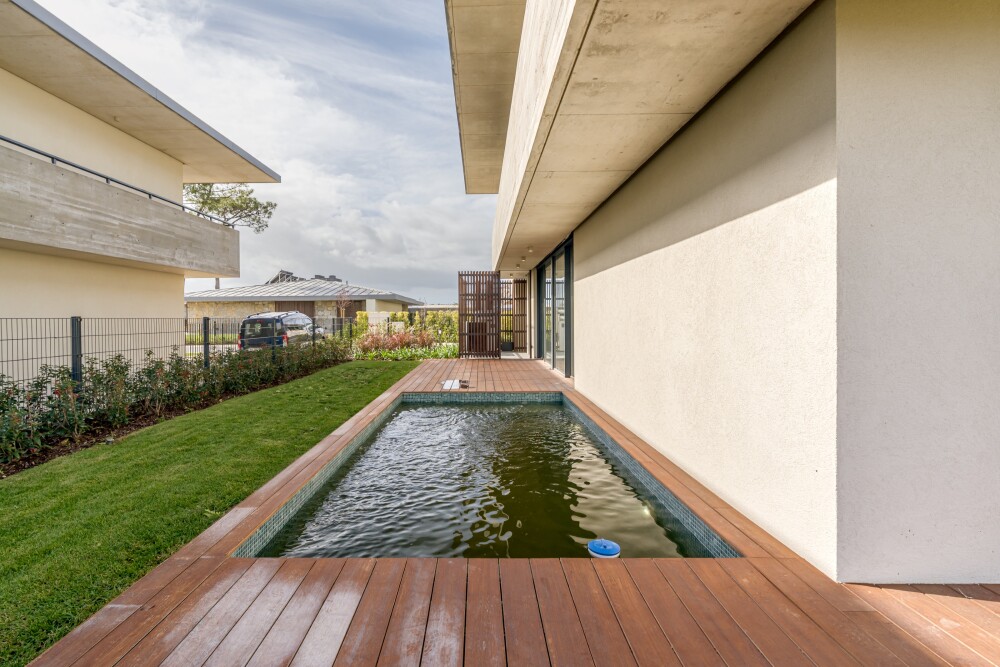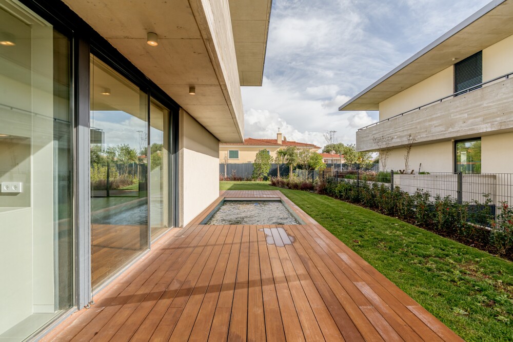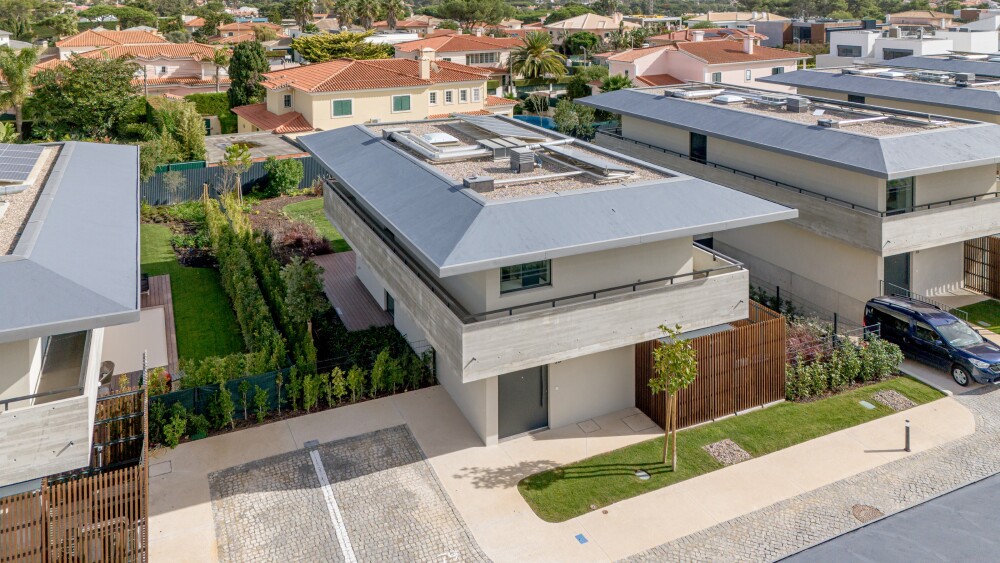 3-bedroom villa with 229 sqm of gross construction area, three parking spaces, private garden, and swimming pool, set within the Sandwoods condominium in Cascais.