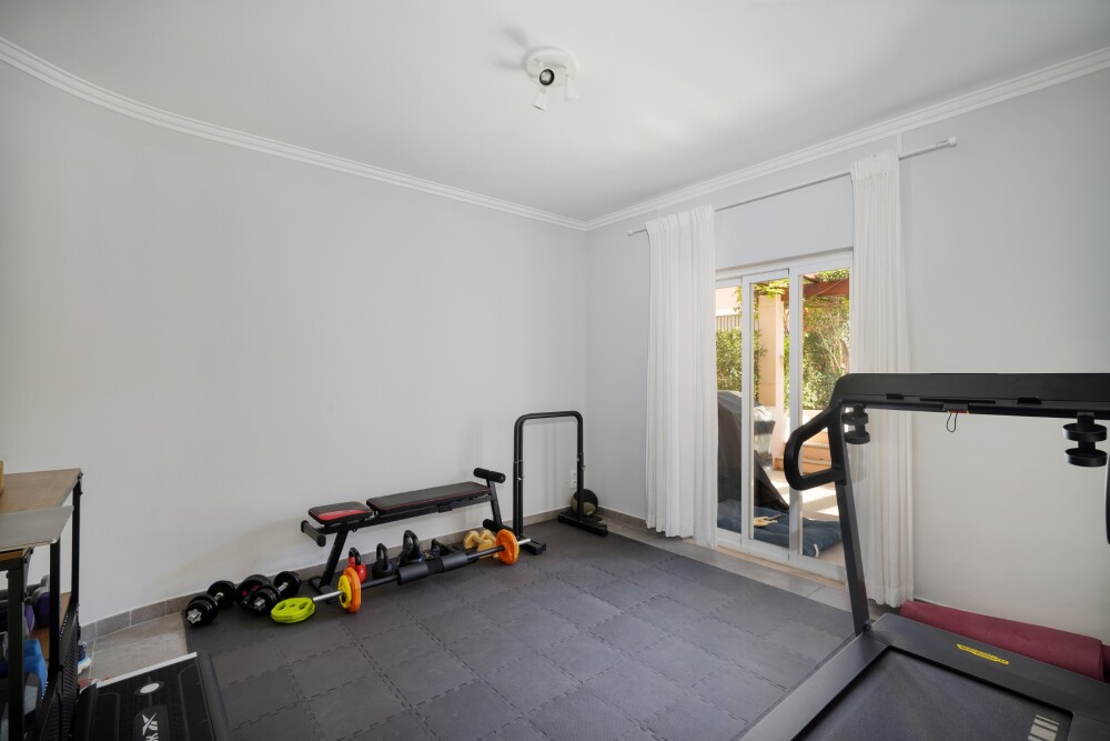 The ground floor also features a bedroom, currently used as a gym, and a full bathroom.