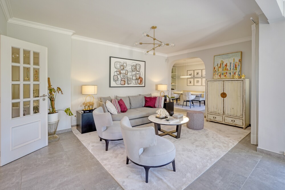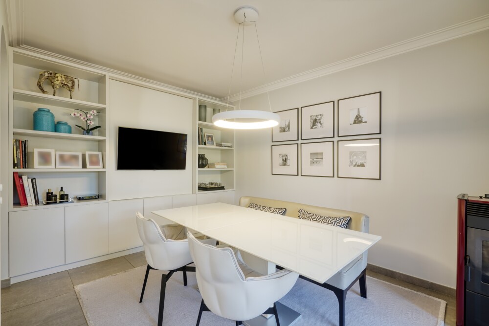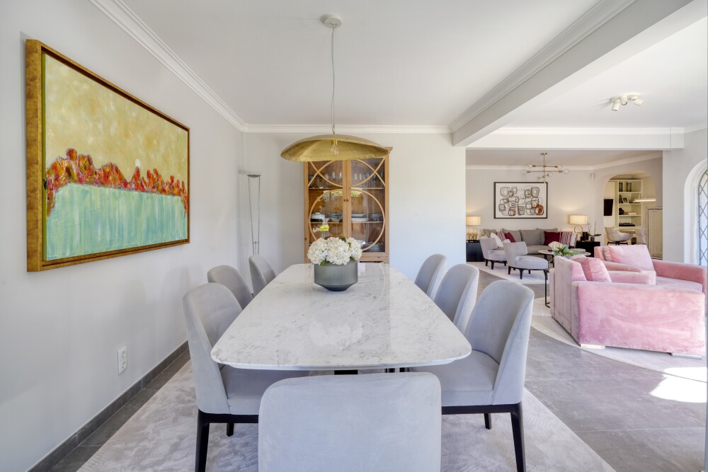 The entrance floor is organized around a hall that leads to a spacious living room with four distinct areas: two sitting areas, a more secluded dining area for guests, and another dining area directly connected to the kitchen, ideal for daily use.
