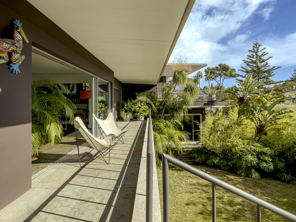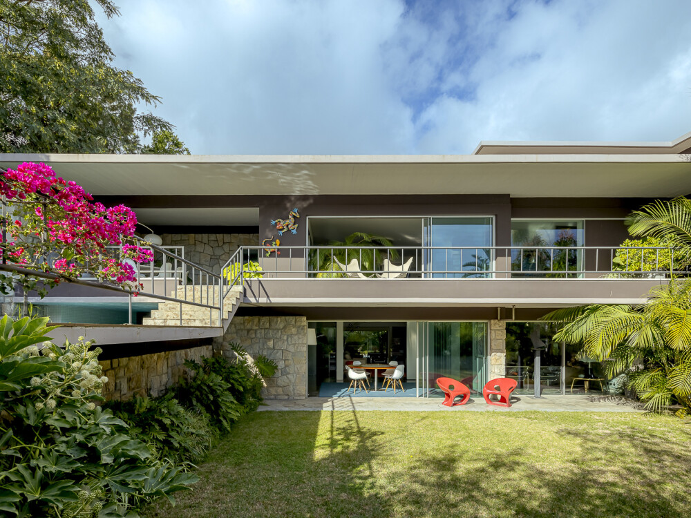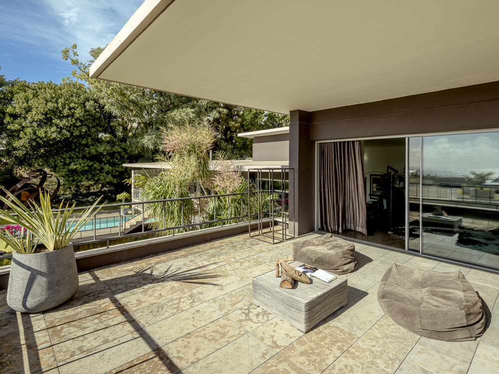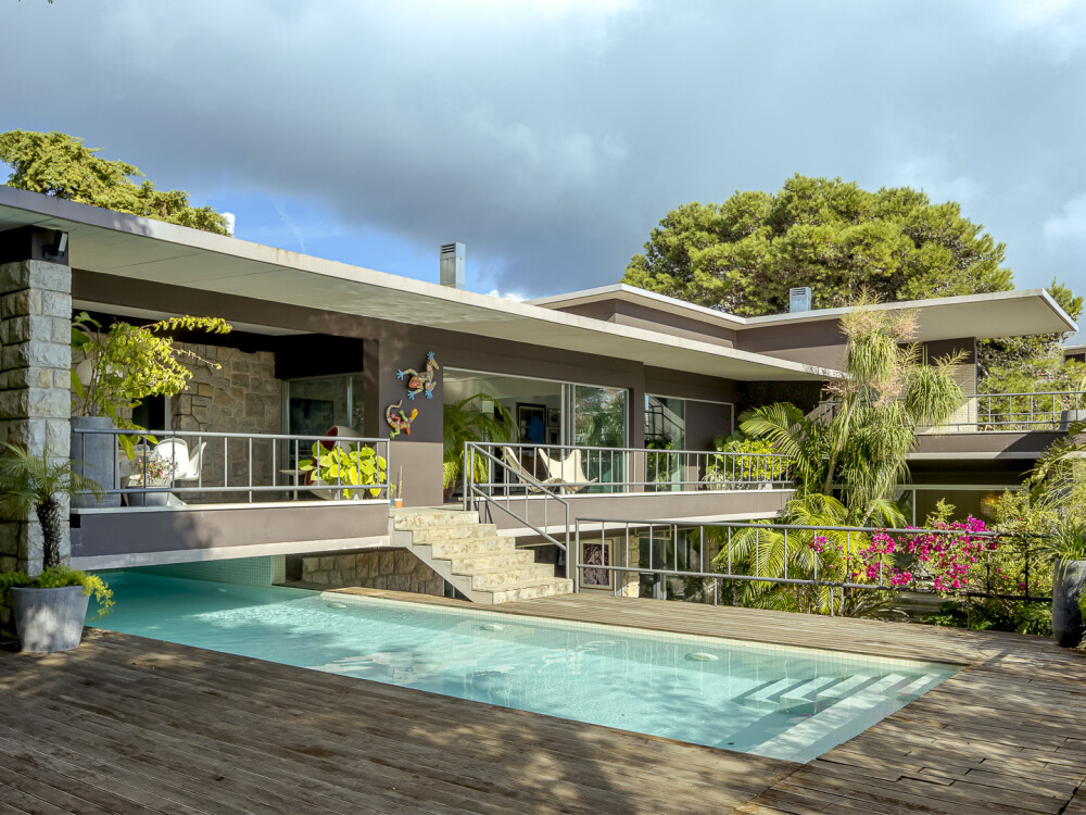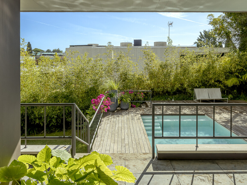 The lower level includes three bedrooms, all with direct access to the garden and pool area.