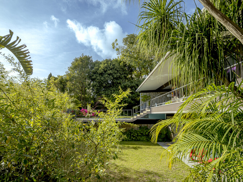 The upper floor consists of an office/bedroom and the master suite, with a full bathroom and a window that opens fully to the garden, offering a view over the pool.