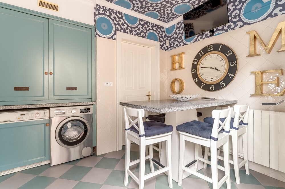 Fully equipped kitchen with laundry area, guest bathroom and a small bedroom with bathroom.