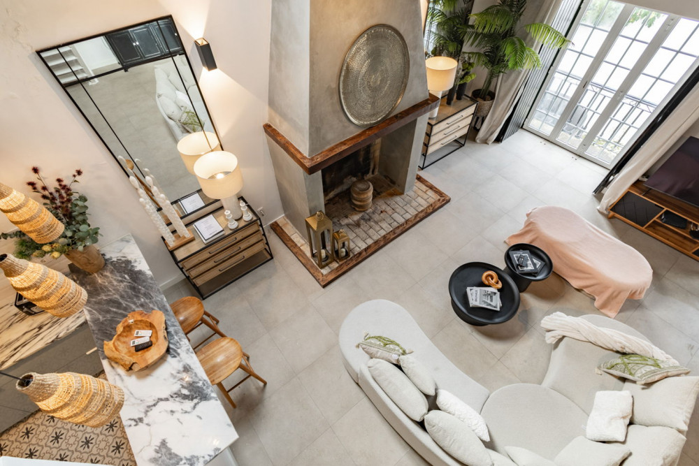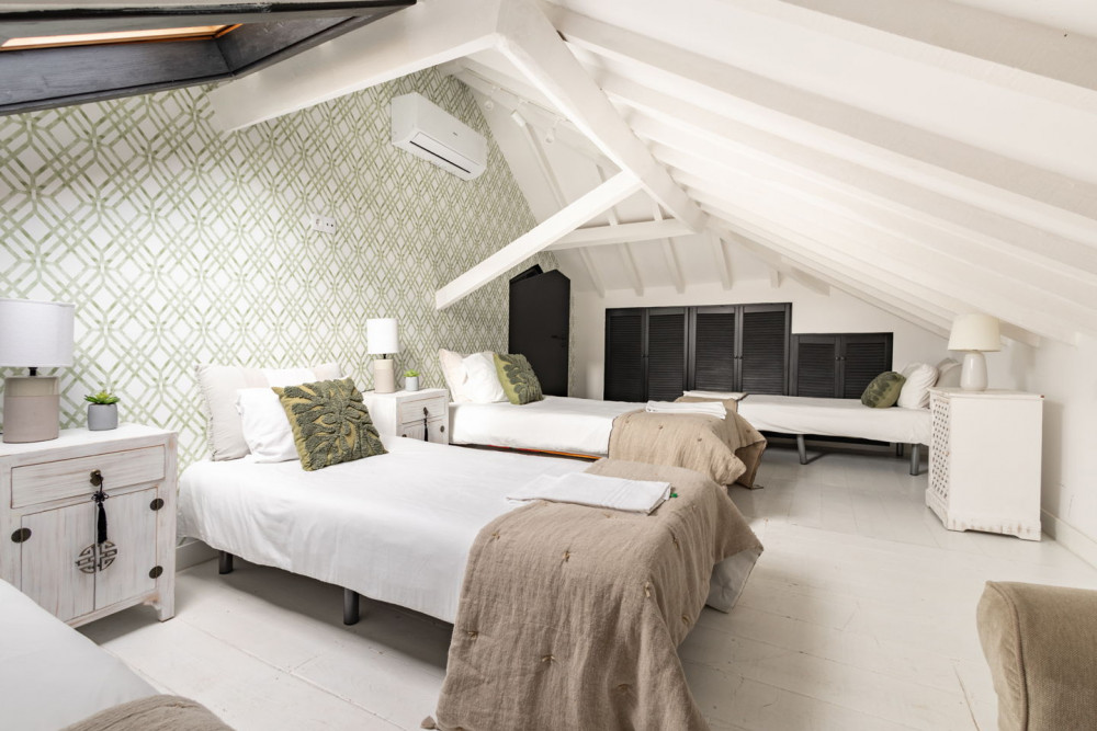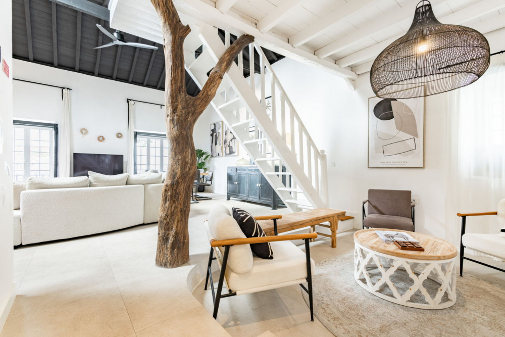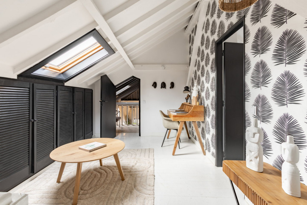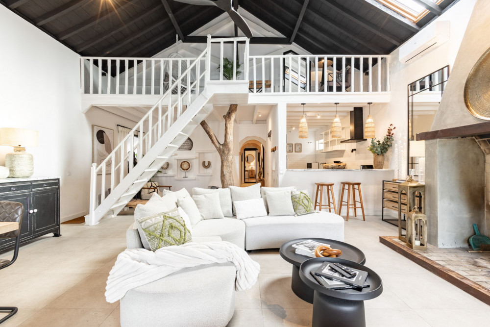 On the upper floor, the mezzanine also offers a living space, along with three bedrooms, an office, and several storage areas.