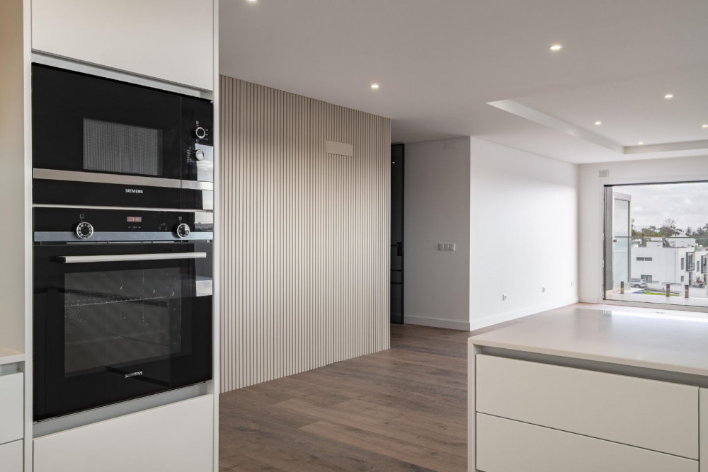 Inside, the spacious and well-distributed areas invite you to fully experience the house. The AC5 floating floor, 10 cm white baseboards, and ceilings with LED lighting create an elegant and welcoming atmosphere. The walls with wallpaper and wood slats add texture and sophistication, while the decorative doors leading to the living room, with gray glass and black frames, give a touch of exclusivity right at the entrance. The kitchen, fully equipped with Siemens appliances, ensures functionality and style for everyday life.