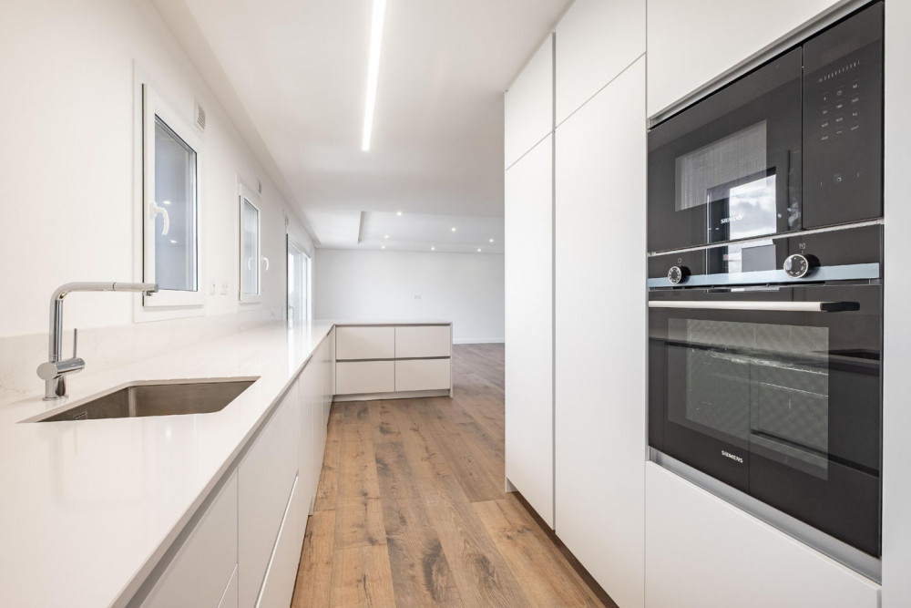 The 3-bedroom apartment consists of an entrance hall that connects the social area to the private area. The open space living room with the kitchen creates a spacious and bright environment, ideal for socializing and family daily life. The kitchen is fully equipped with an oven, hob, microwave, extractor fan, combined refrigerator, dishwasher, washing machine, and dryer, ensuring full functionality. It also has a complete guest bathroom.