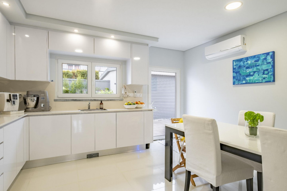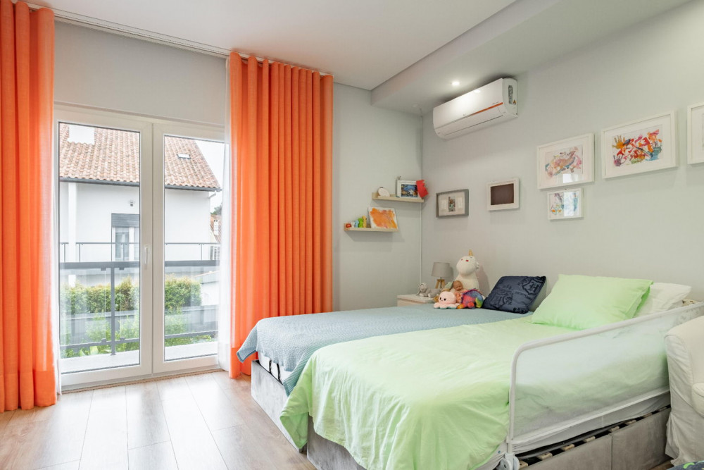 This house has a heat recovery unit with ventilation for the bedrooms and air conditioning throughout the house except on the top floor.