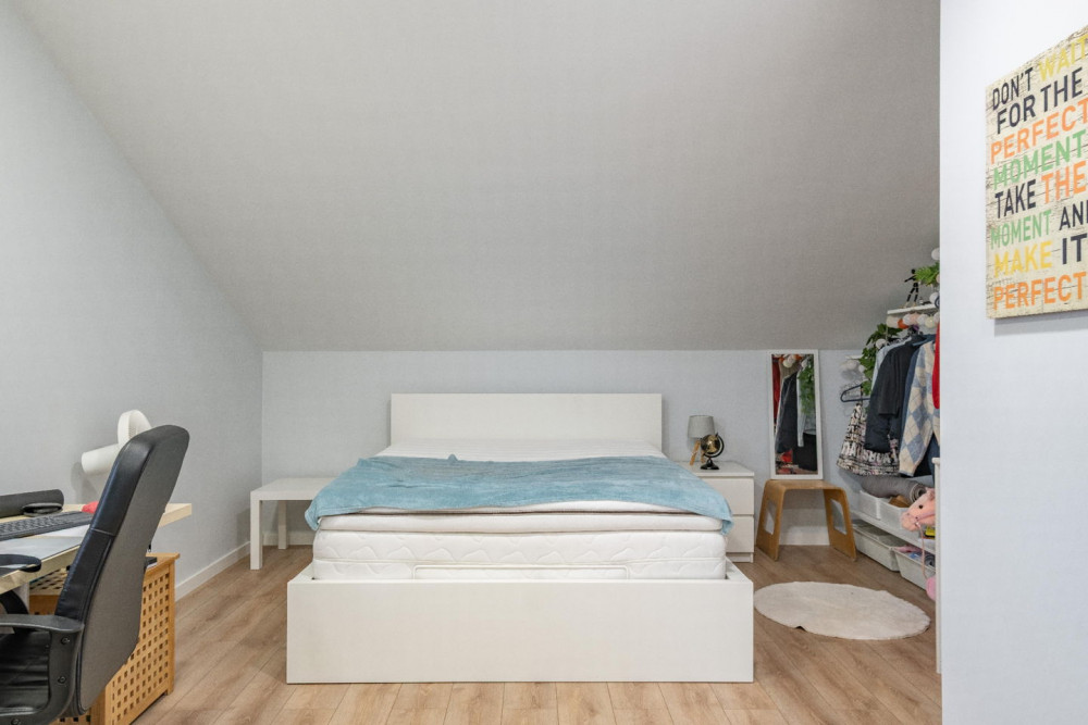 In the attic, there is a bedroom with a full bathroom and a storage room.