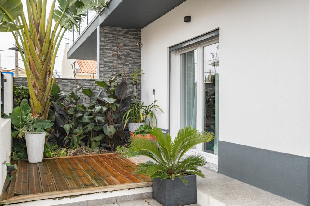 Outside, at the rear of the house, there is a 16m² garage and a patio with a small garden. On the side, there is a circulation area and access to the garage, and in the entrance area, there is a terrace with a flower box.