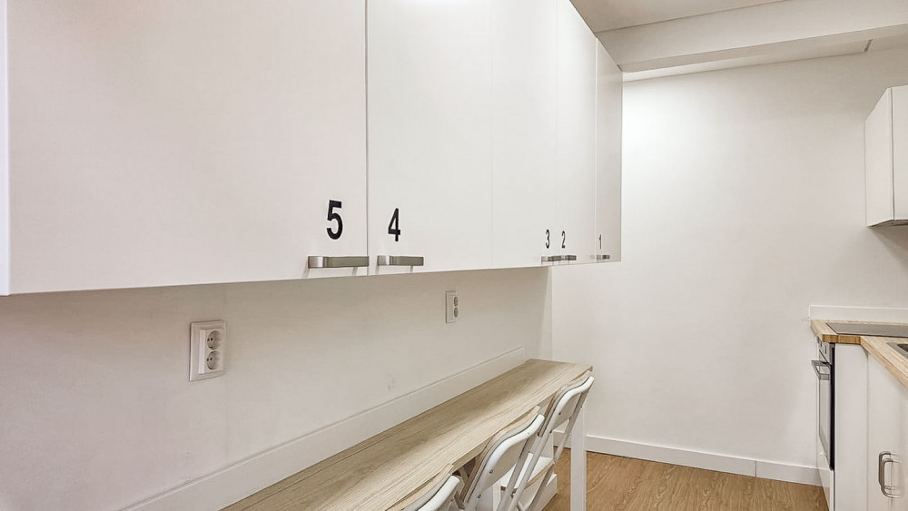 The rooms are numbered, from 1 to 5 and equipped with a bed and wardrobe, one of which is en suite. The property has three bathrooms, all with shower cabins, a fully equipped kitchen with labeled cabinets, an isolated laundry area, and areas repurposed from former balconies, optimizing the space.