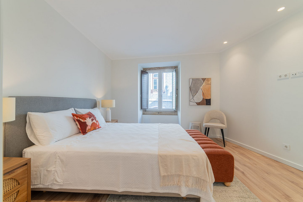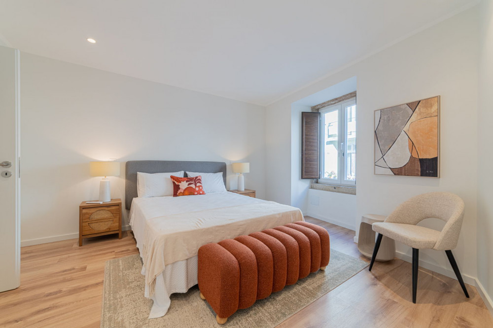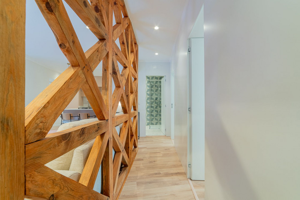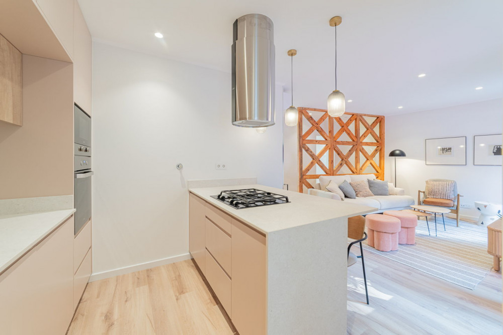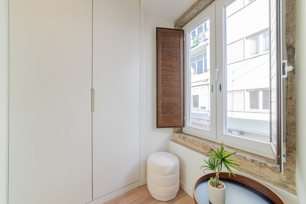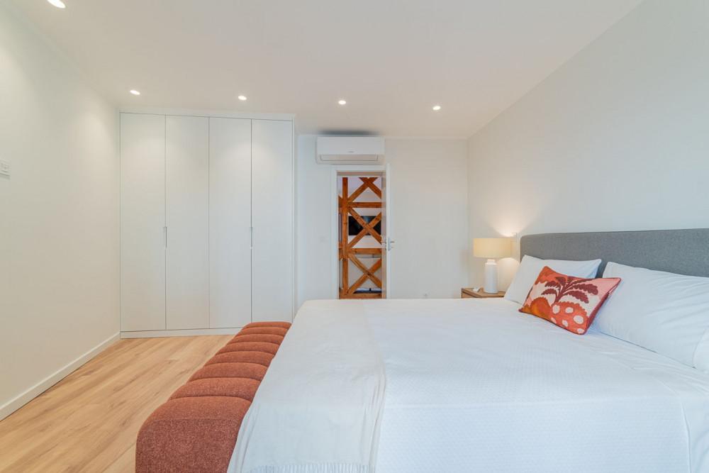 The social area includes a full bathroom with a shower cabin, which serves both as a support for the single bedroom and as a guest toilet. The open-plan living room and kitchen embody a contemporary and fluid concept, ideal for social gatherings, where the exposed Pombaline cage adds extra charm. The kitchen is fully equipped with high-quality TEKA appliances and features a practical peninsula for meals. Complementing this area, the apartment also has a separate laundry room equipped with washing and drying machines.