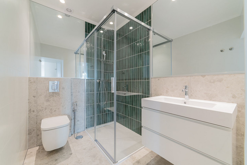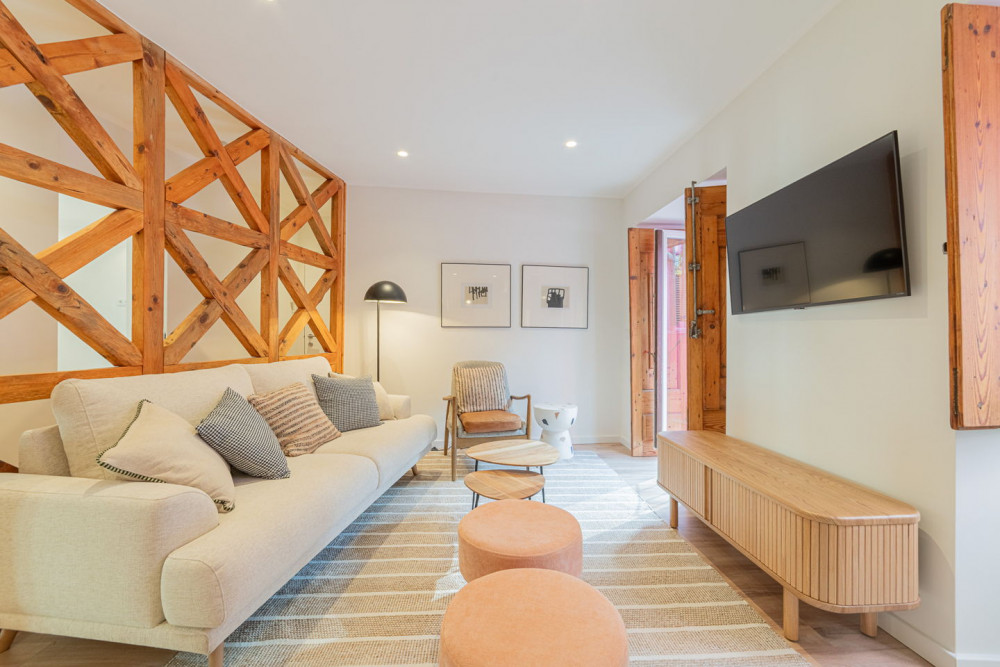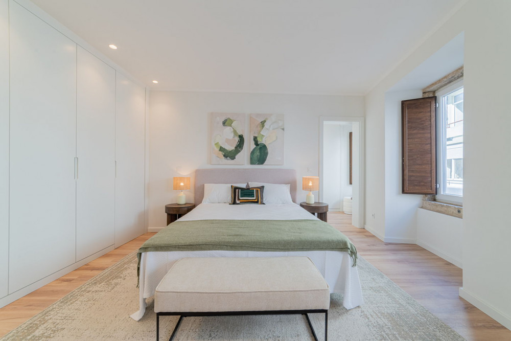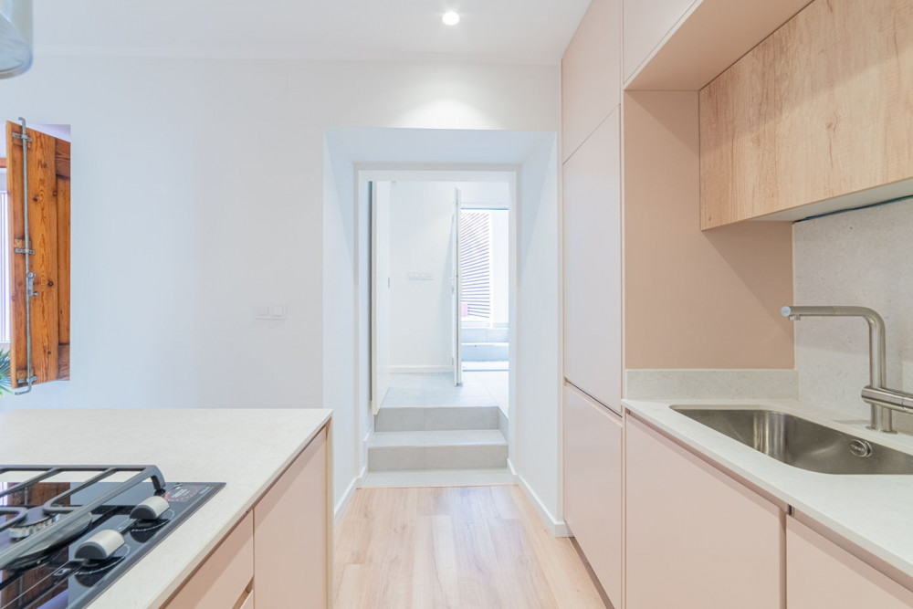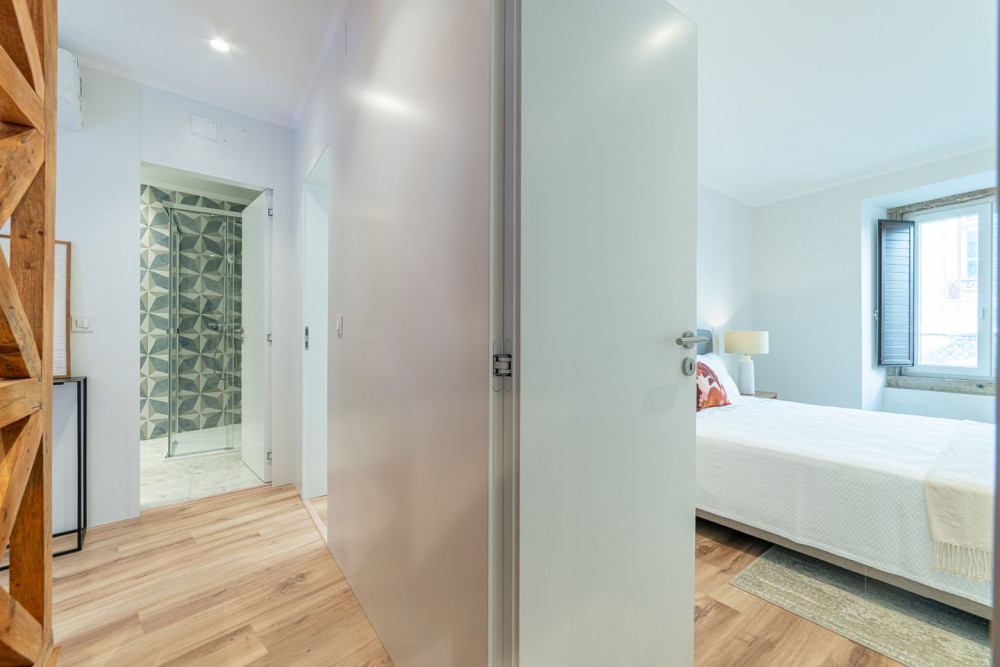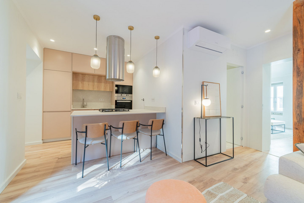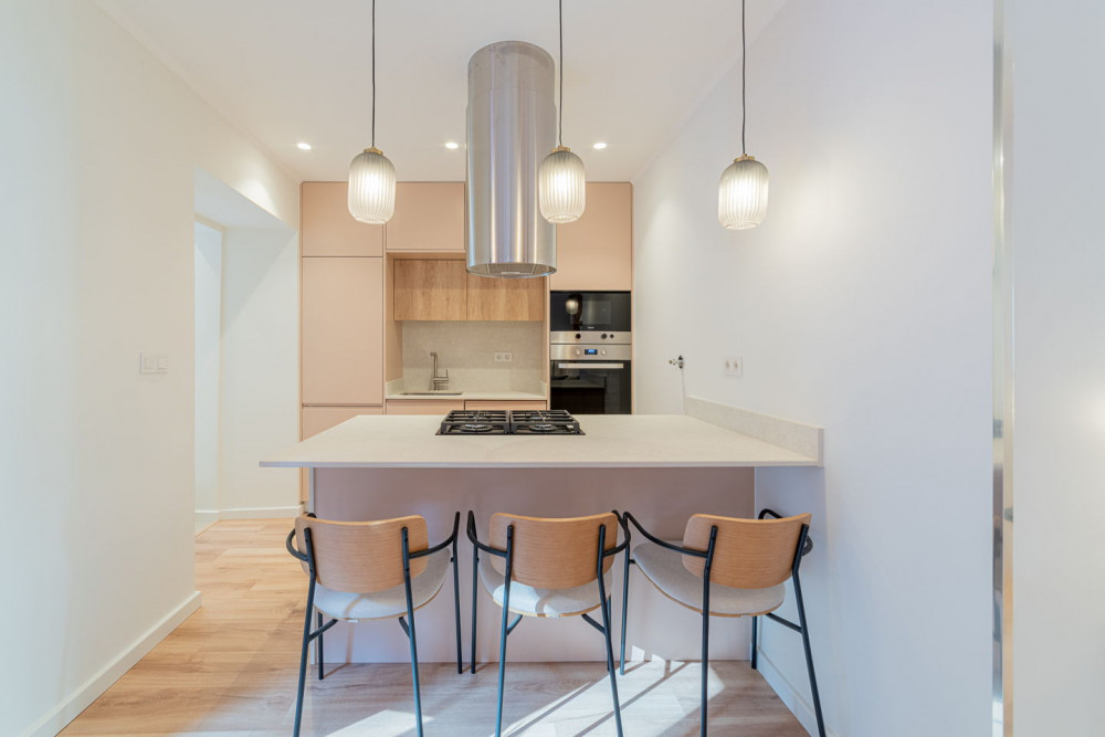 The social area includes a full bathroom with a shower cabin, which serves both as a support for the single bedroom and as a guest toilet. The open-plan living room and kitchen embody a contemporary and fluid concept, ideal for social gatherings, where the exposed Pombaline cage adds extra charm. The kitchen is fully equipped with high-quality TEKA appliances and features a practical peninsula for meals. Complementing this area, the apartment also has a separate laundry room equipped with washing and drying machines.