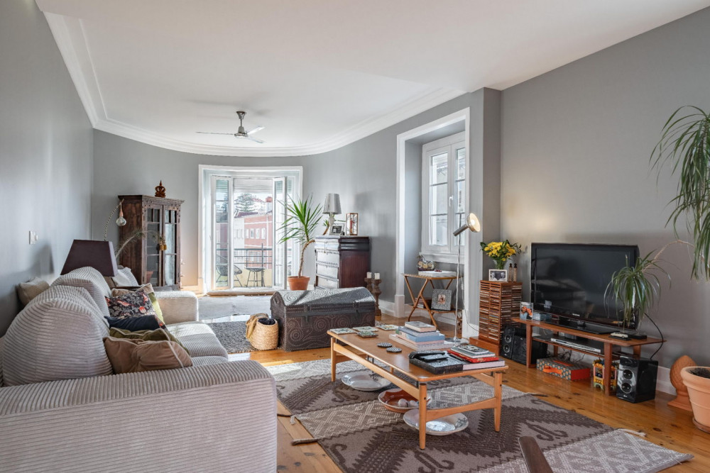 The spacious living room, measuring 29 m², is a true urban retreat — bright and welcoming, it opens through French doors to a balcony with an unobstructed view over the rooftops of Lisbon and a charming glimpse of the Miradouro da Senhora do Monte.