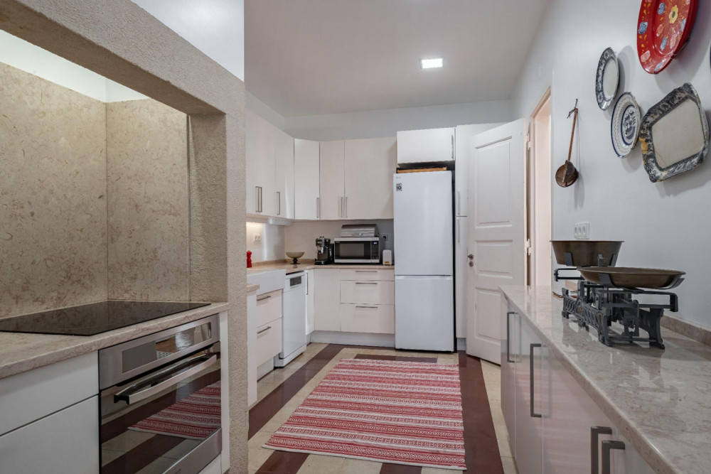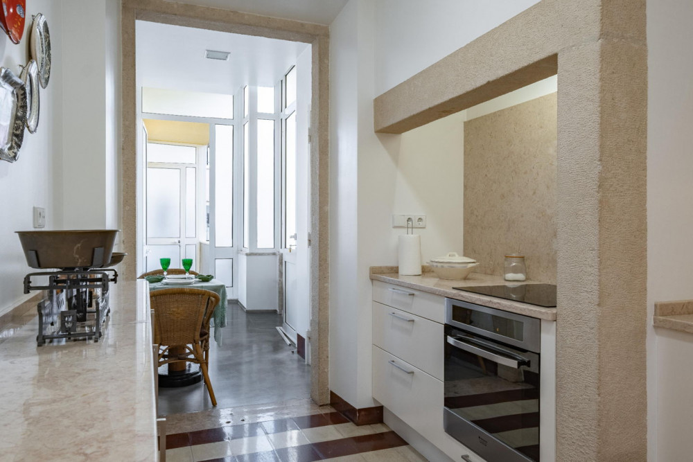 The kitchen preserves its original charm with hydraulic tiles and a Portuguese stone chimney, where tradition and modern functionality meet. It is fully equipped and features a casual dining area, a 7 m² balcony with service entrance, and an independent laundry room.