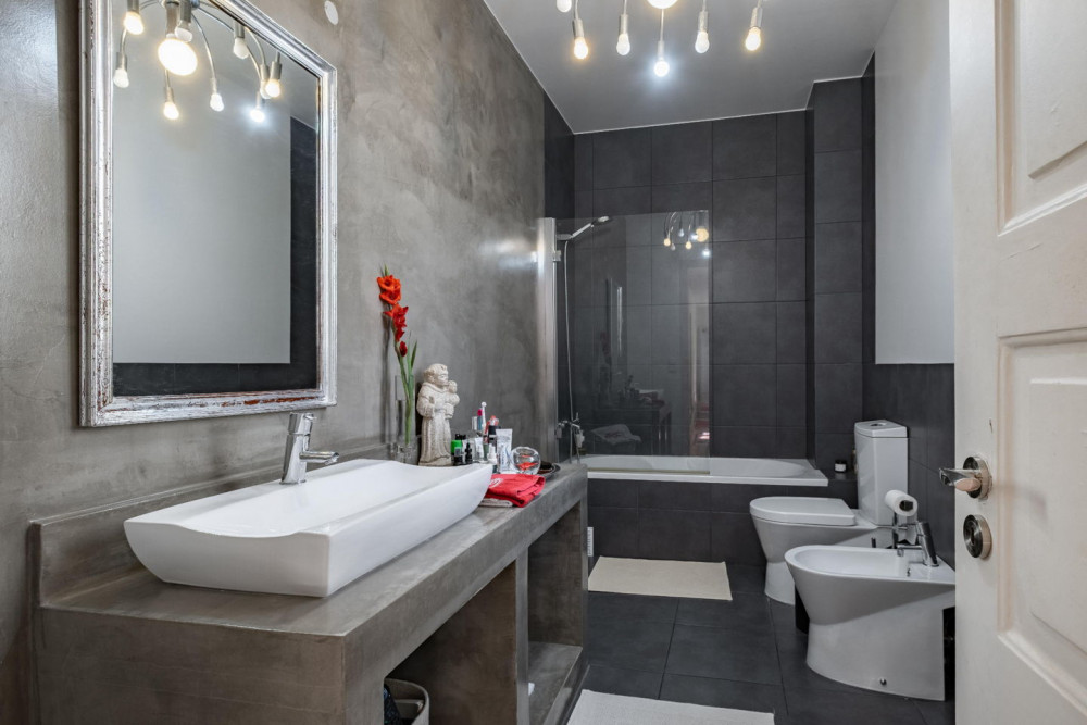 The two bathrooms reflect a contemporary and sophisticated aesthetic — one features polished concrete finishes and a bathtub, and the other is a guest bathroom, strategically located next to the hall.